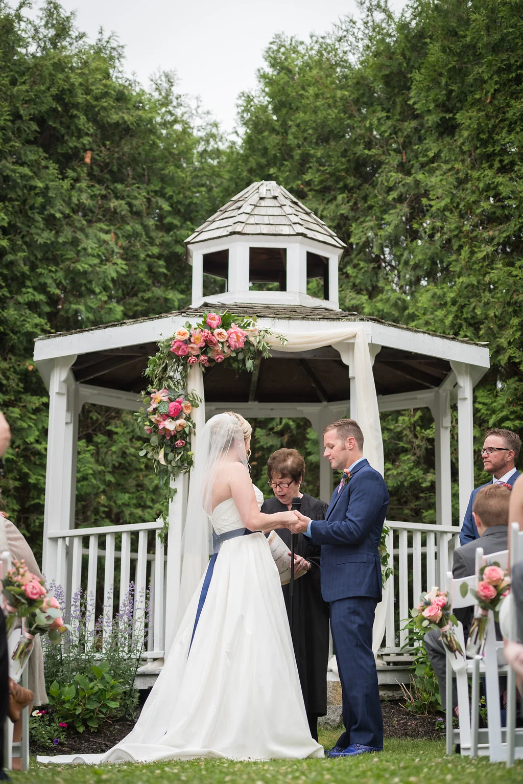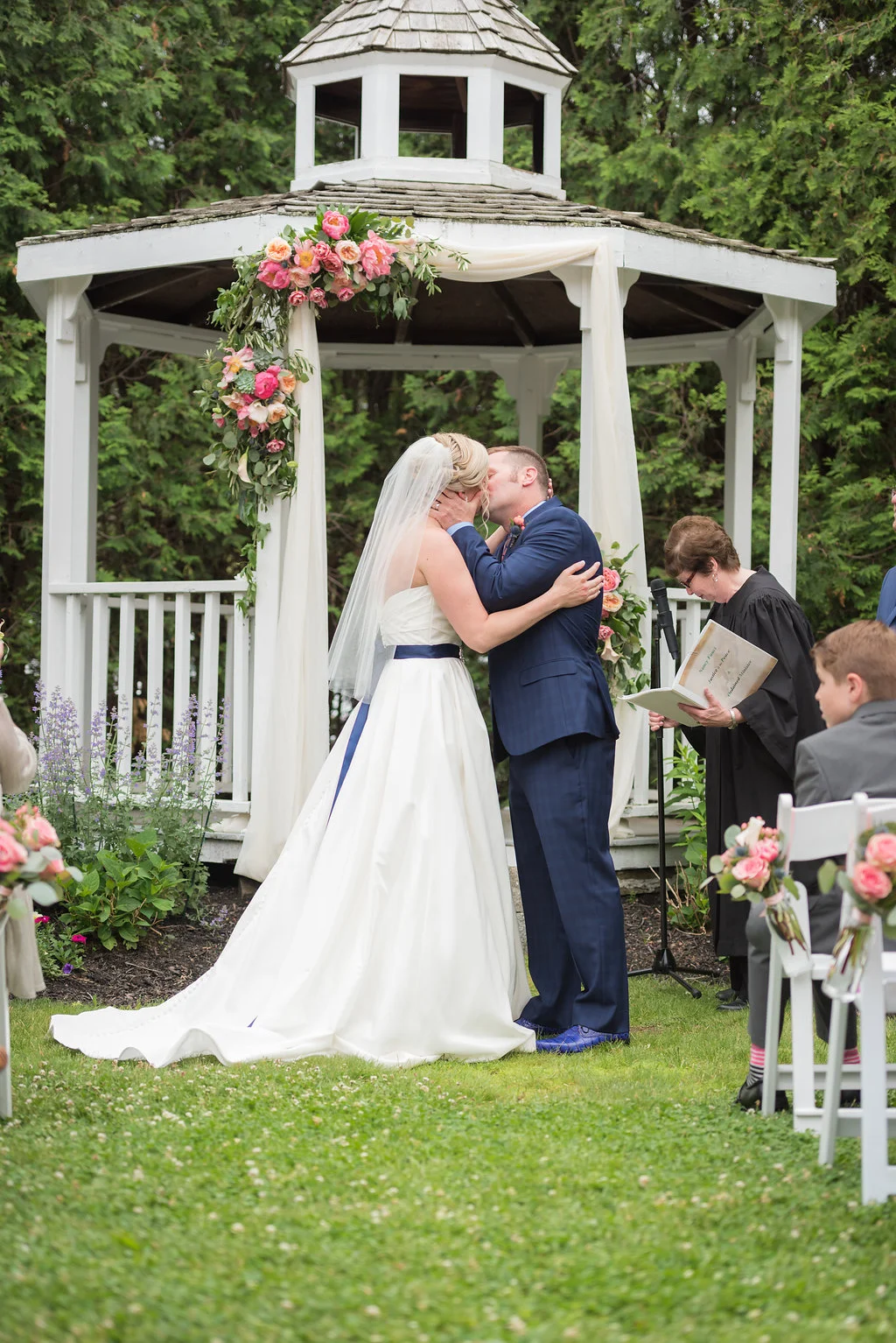 I soon caught up with Lance and his groomsmen in the Inn’s lobby were we made some photos of them just as guests were arriving to the ceremony site situated outside in the back of the Inn with a gazebo backdrop and beautifully arranged flowers by Cymbidium Floral of Exeter decorating guest chairs and the gazebo itself.