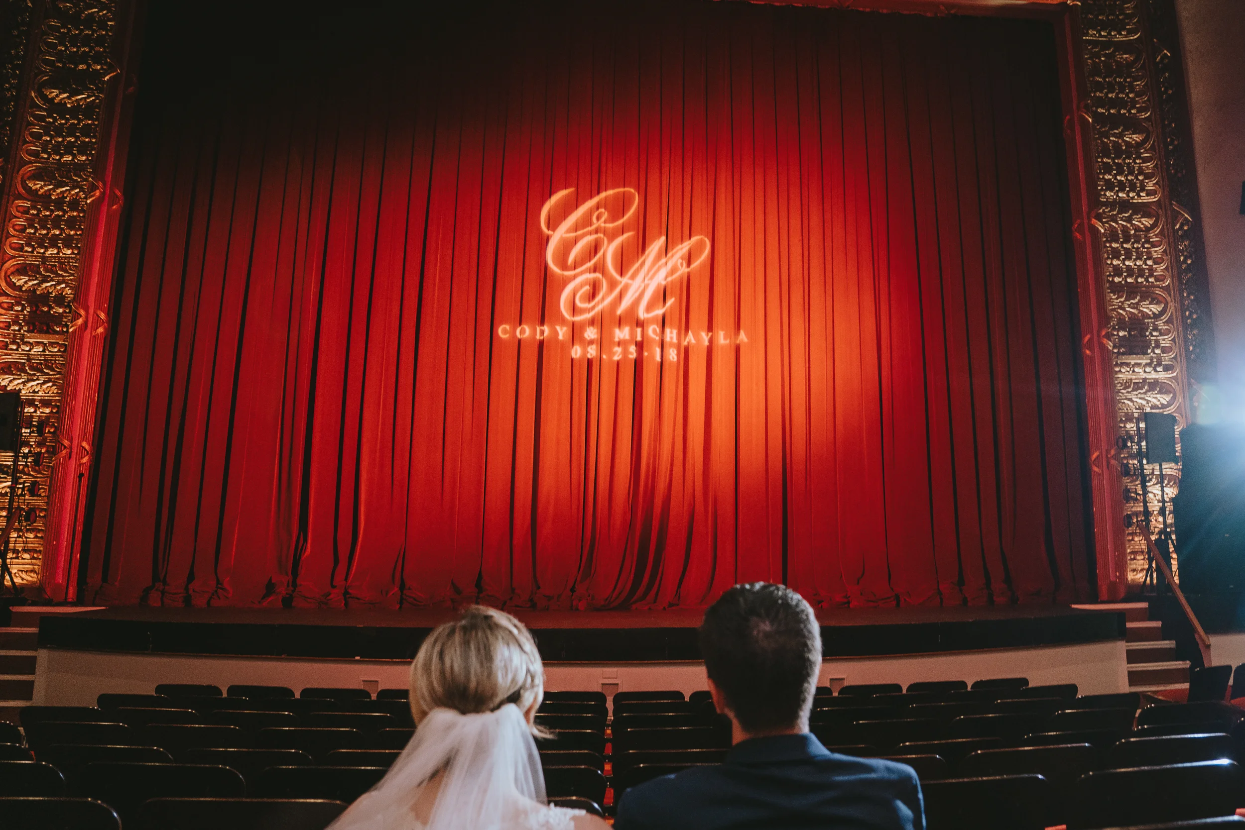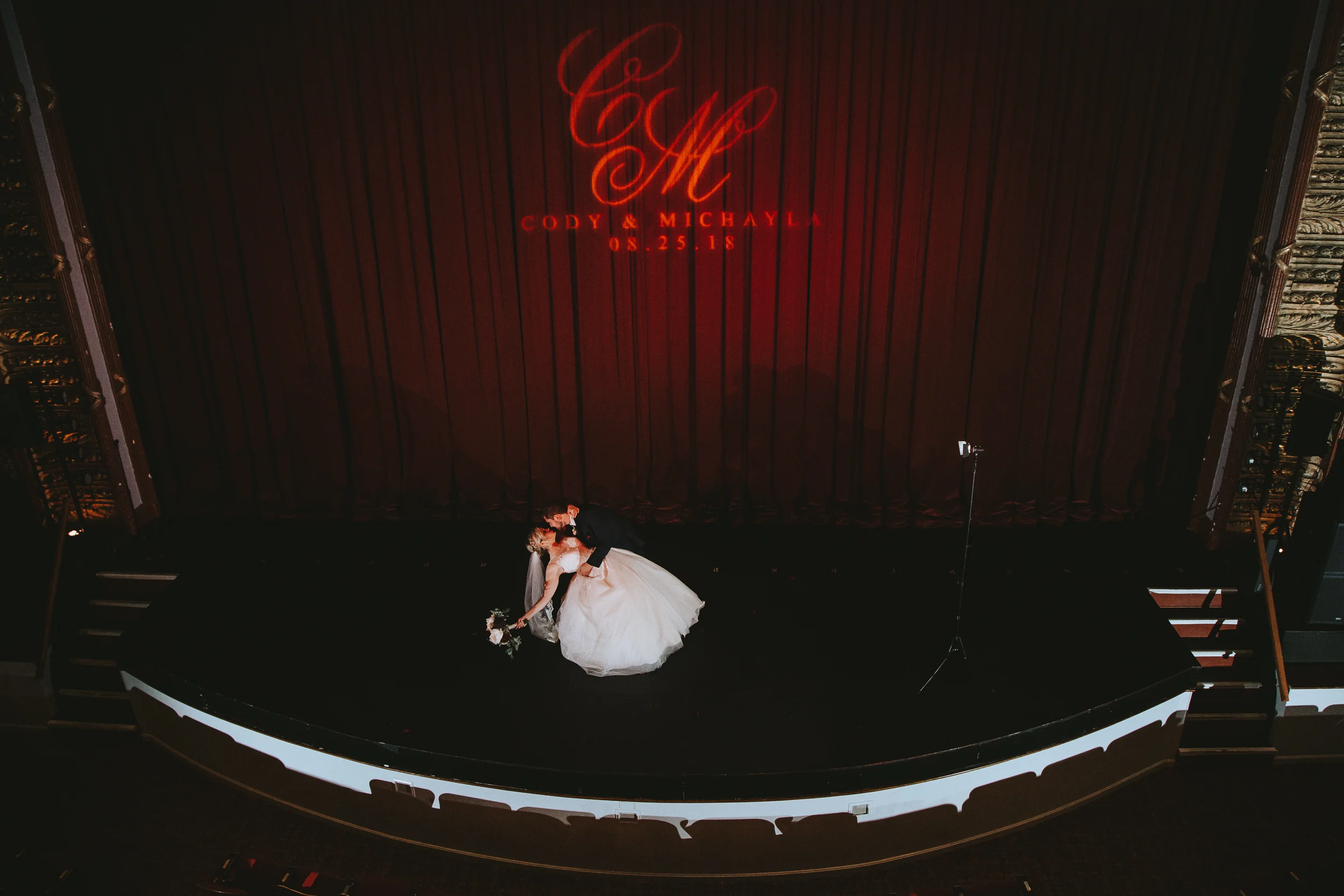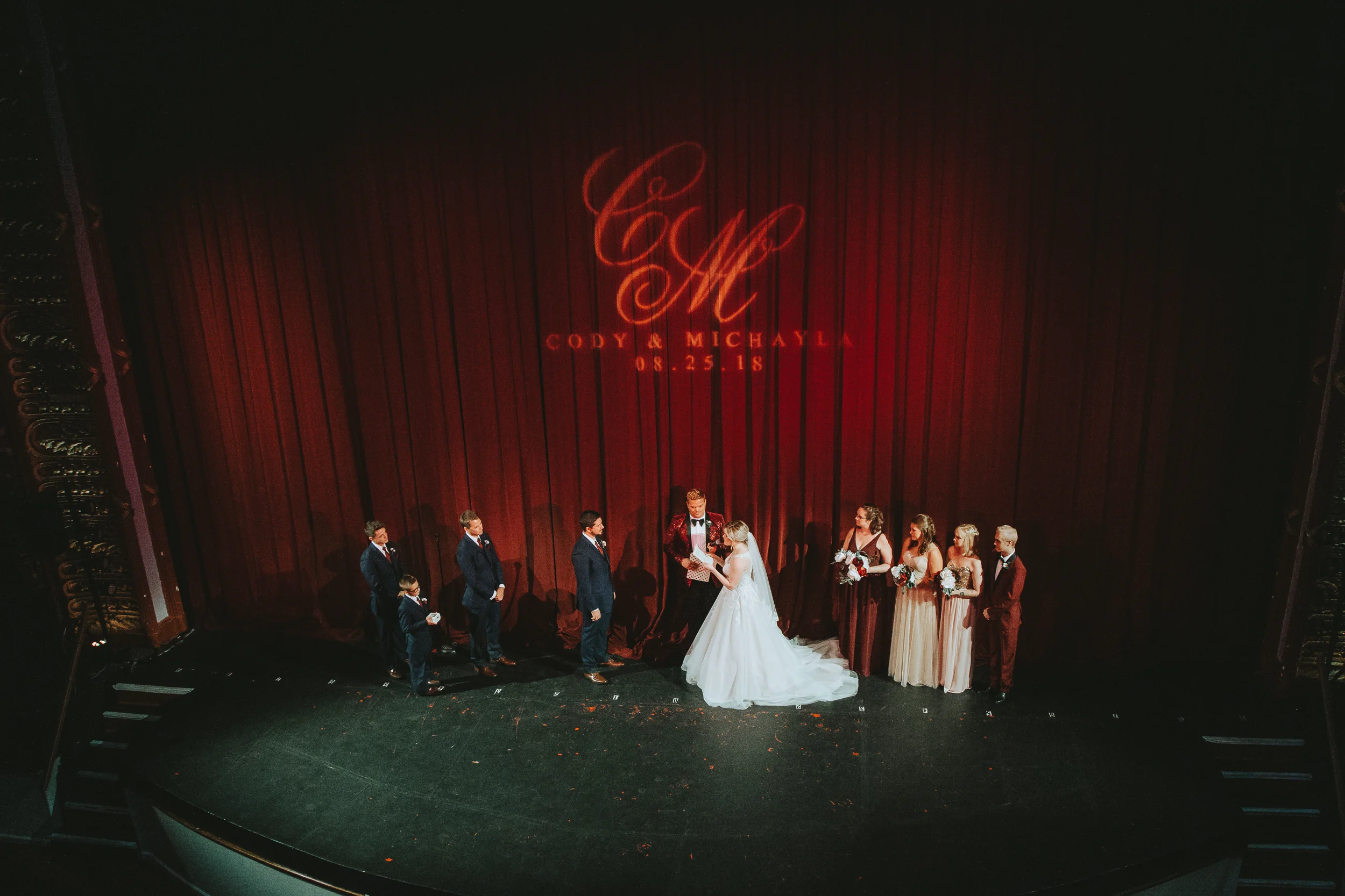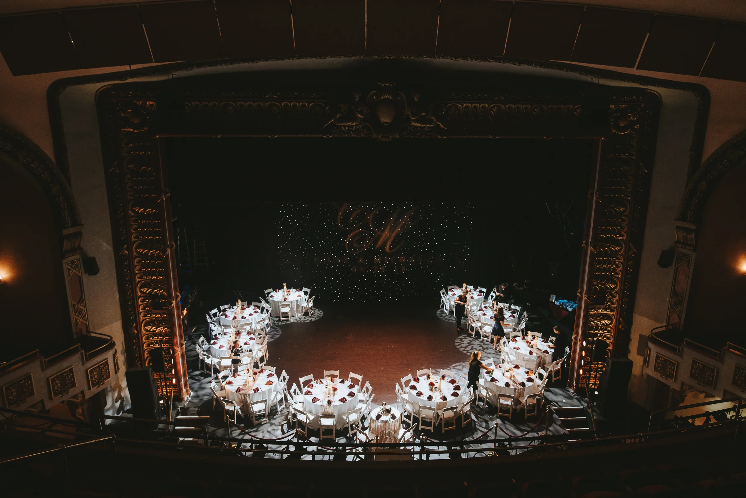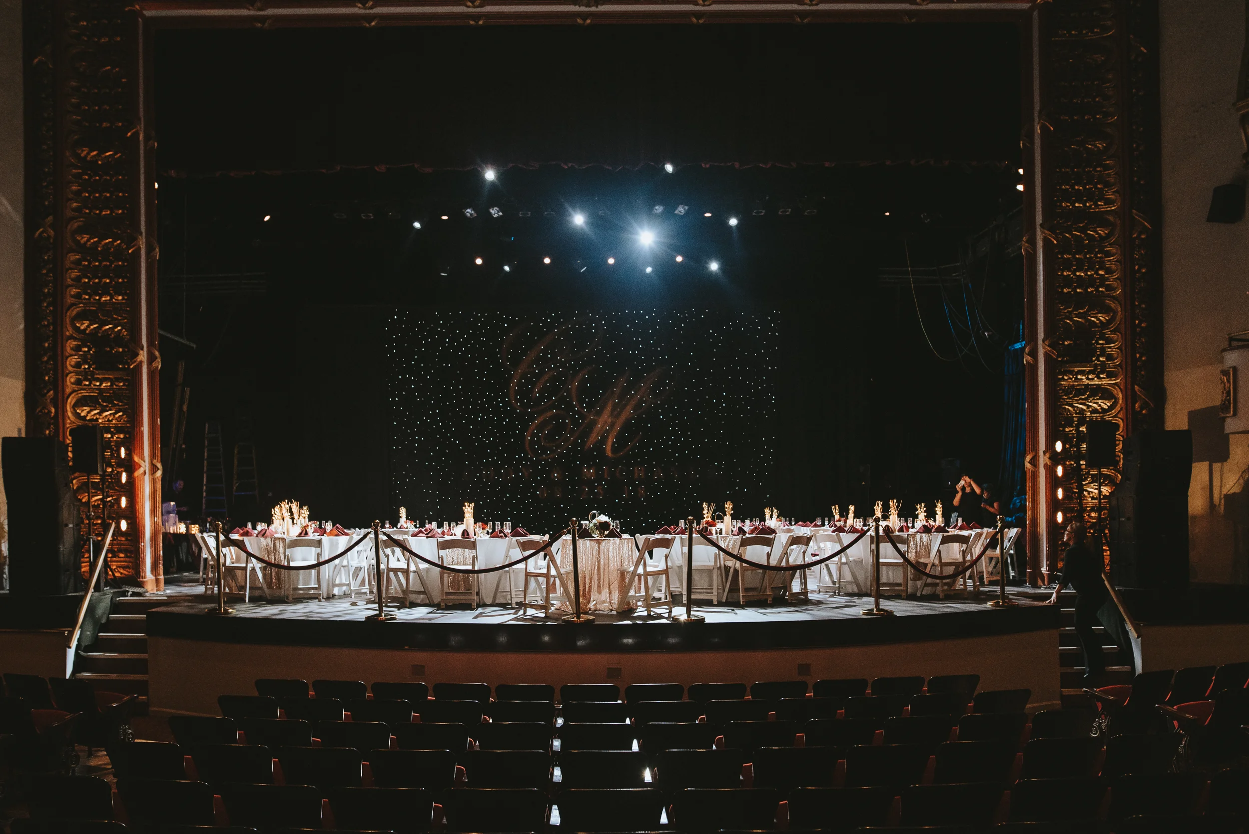 The ceremony took place right on the stage as well, and a quick transformation of the stage during cocktail hour, turned the area into a magical reception space, with artistic lighting, upscale table decor, and a stunning celestial backdrop that tied the overall aesthetic together remarkably well. Intros, toasts, dinner, and dancing followed, culminating with our heading out into the warm, starry, summer evening for some epic night shots in front of the Theatre.