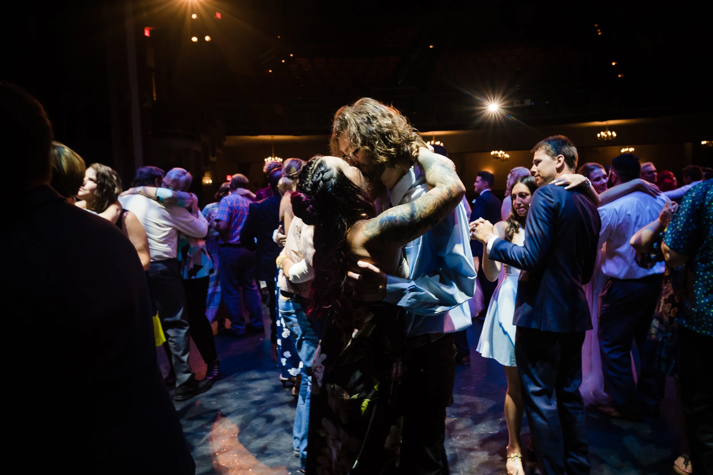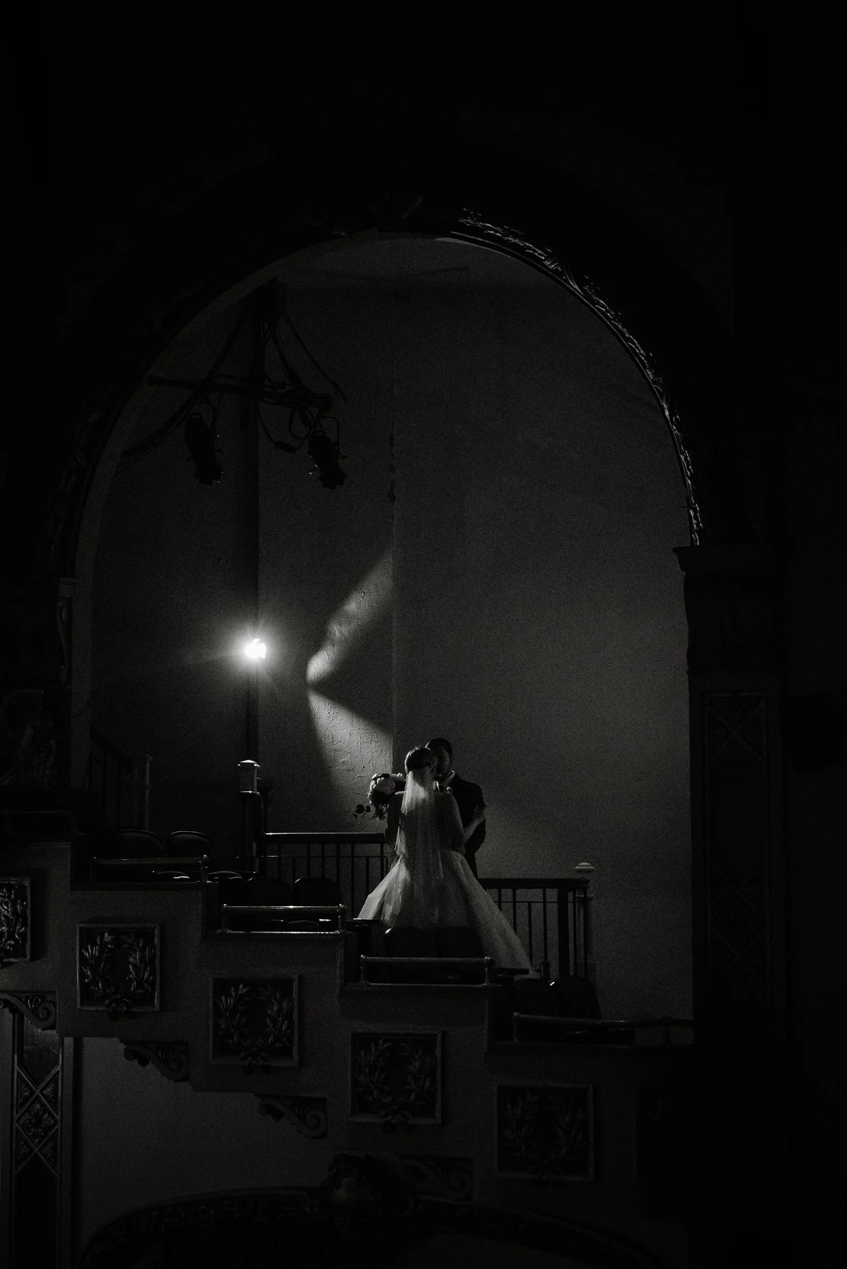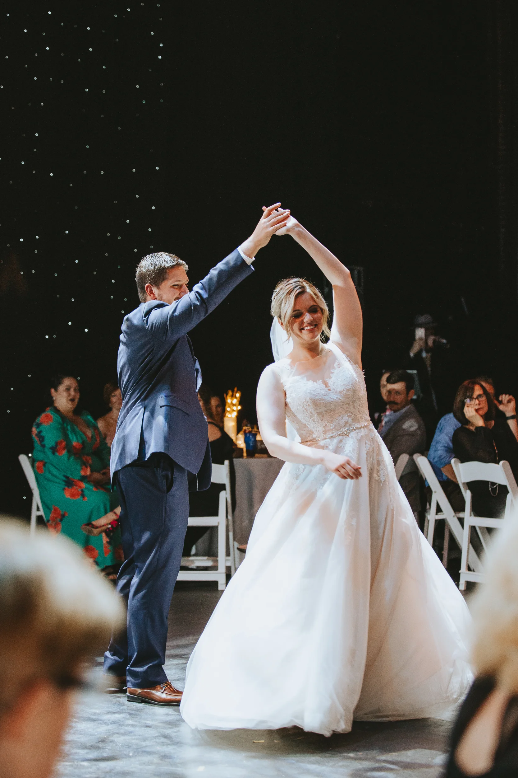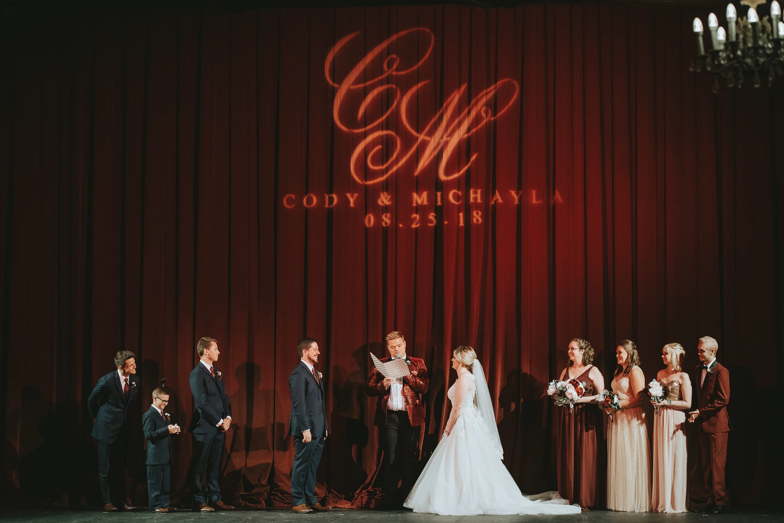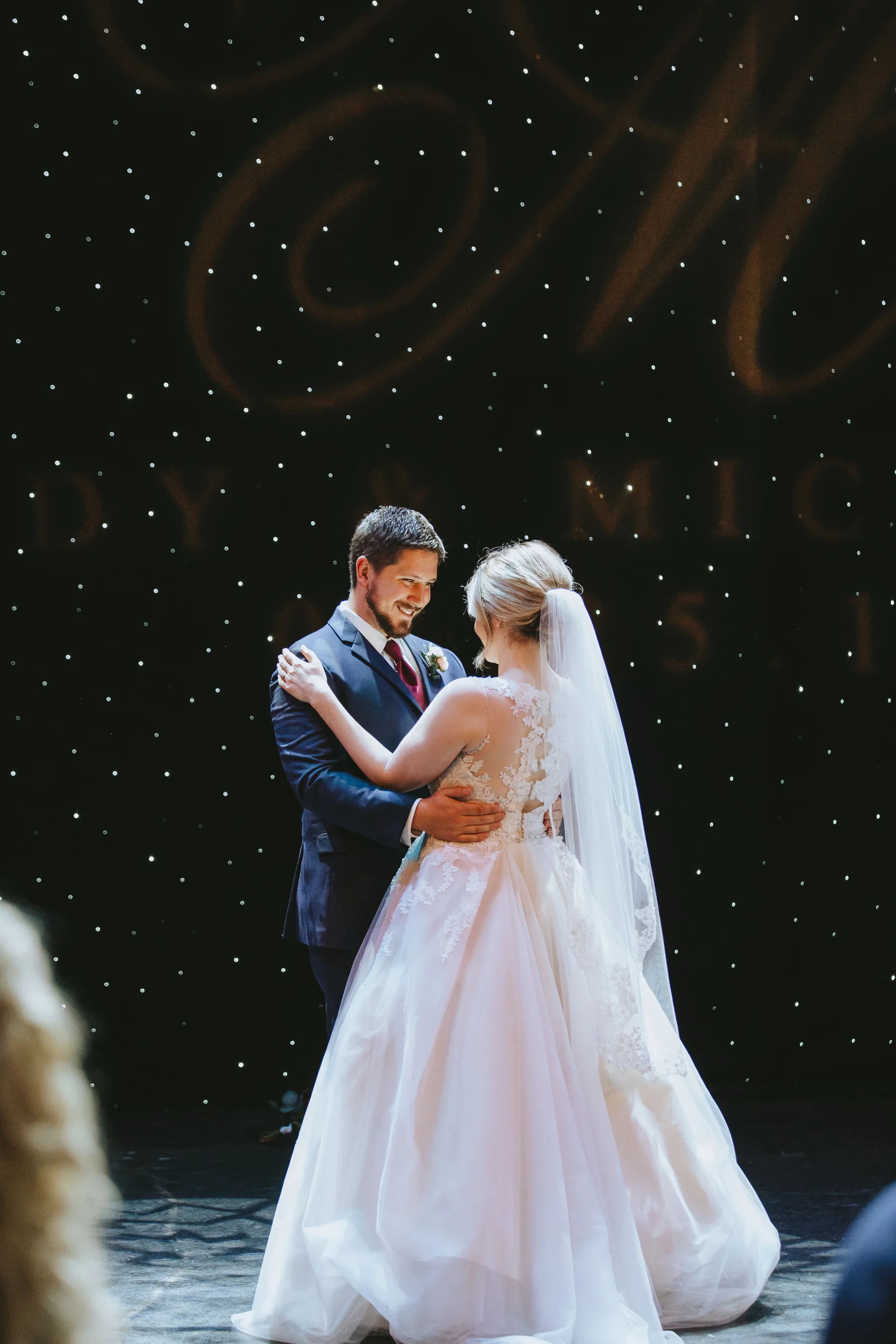 The ceremony took place right on the stage as well, and a quick transformation of the stage during cocktail hour, turned the area into a magical reception space, with artistic lighting, upscale table decor, and a stunning celestial backdrop that tied the overall aesthetic together remarkably well. Intros, toasts, dinner, and dancing followed, culminating with our heading out into the warm, starry, summer evening for some epic night shots in front of the Theatre.
