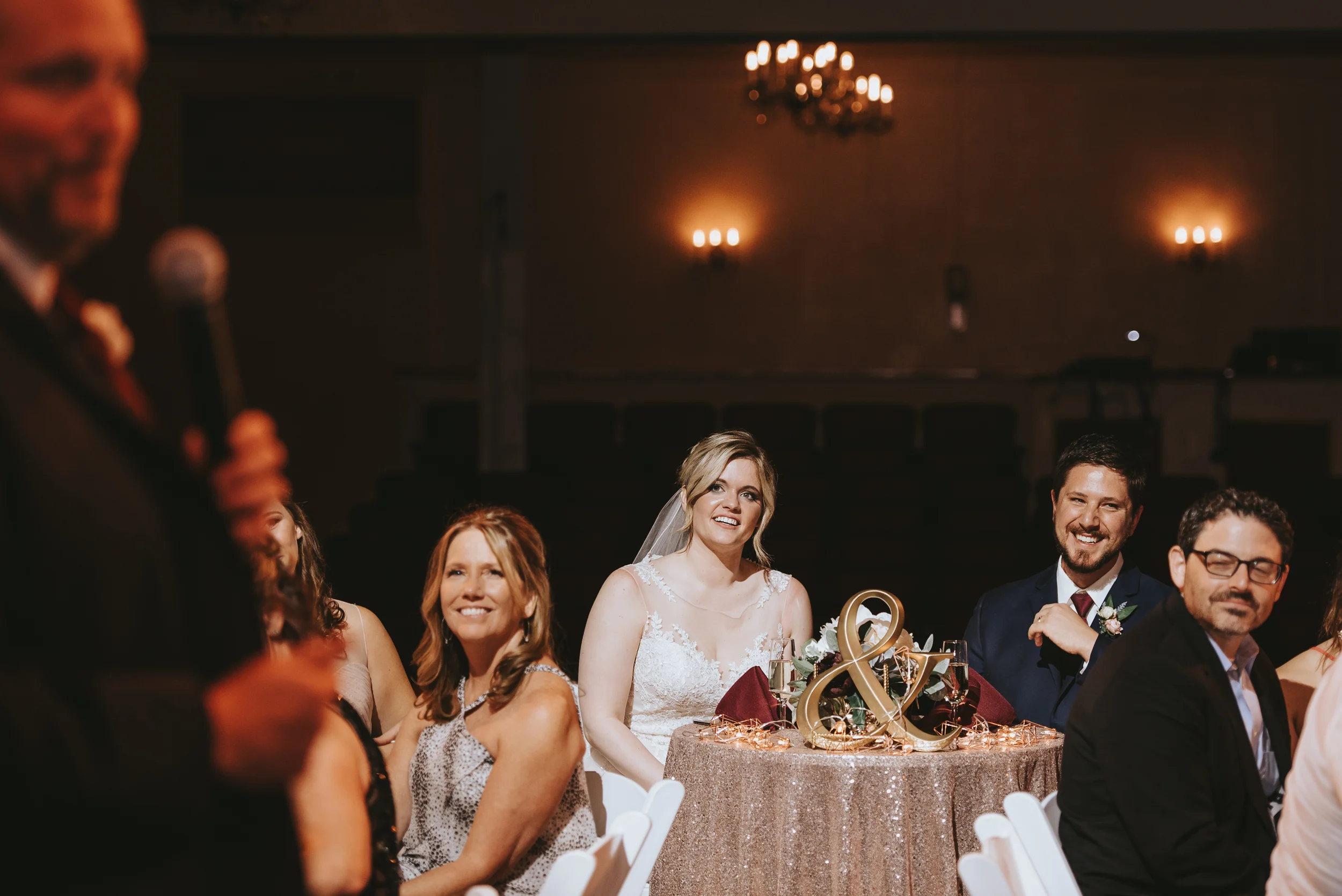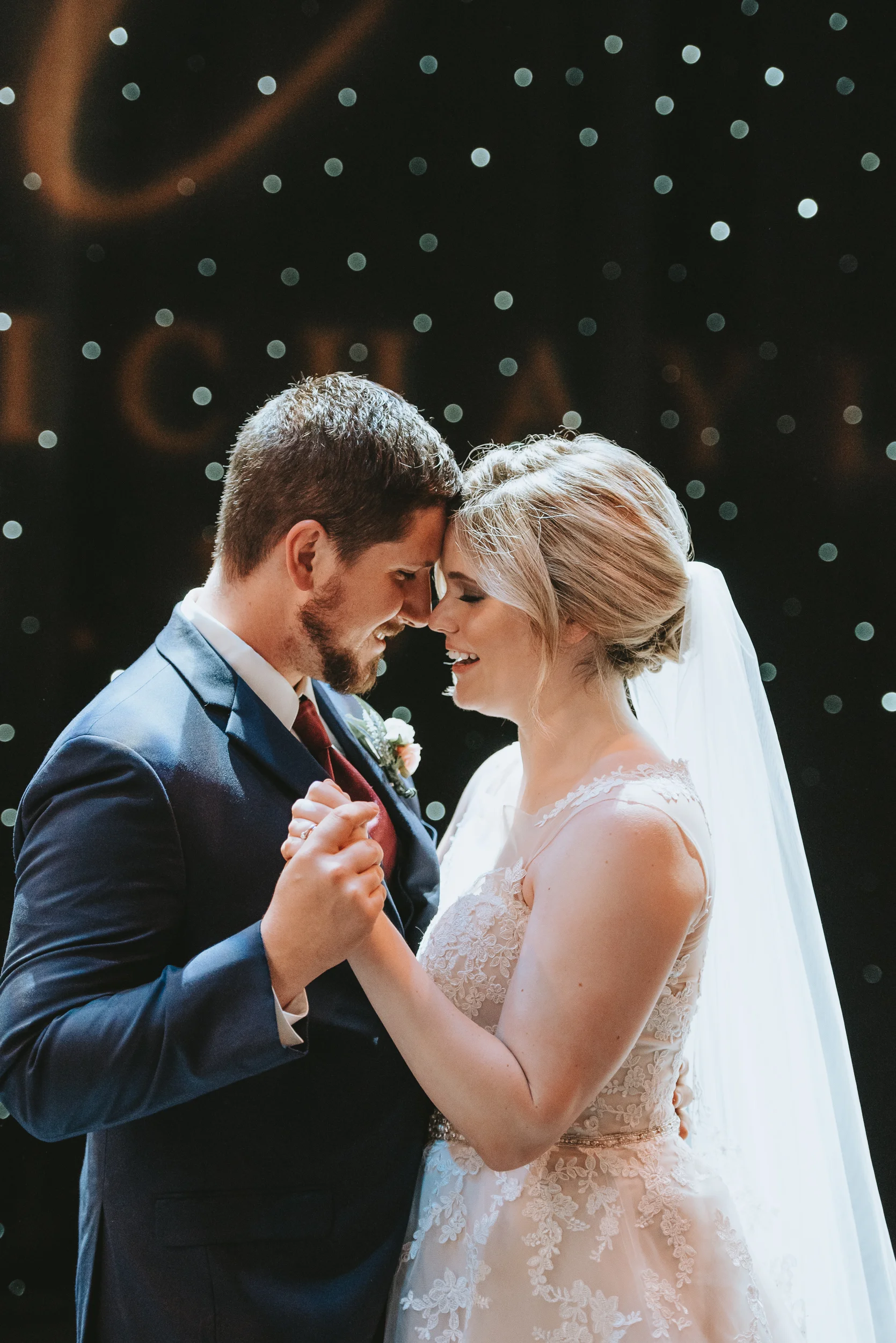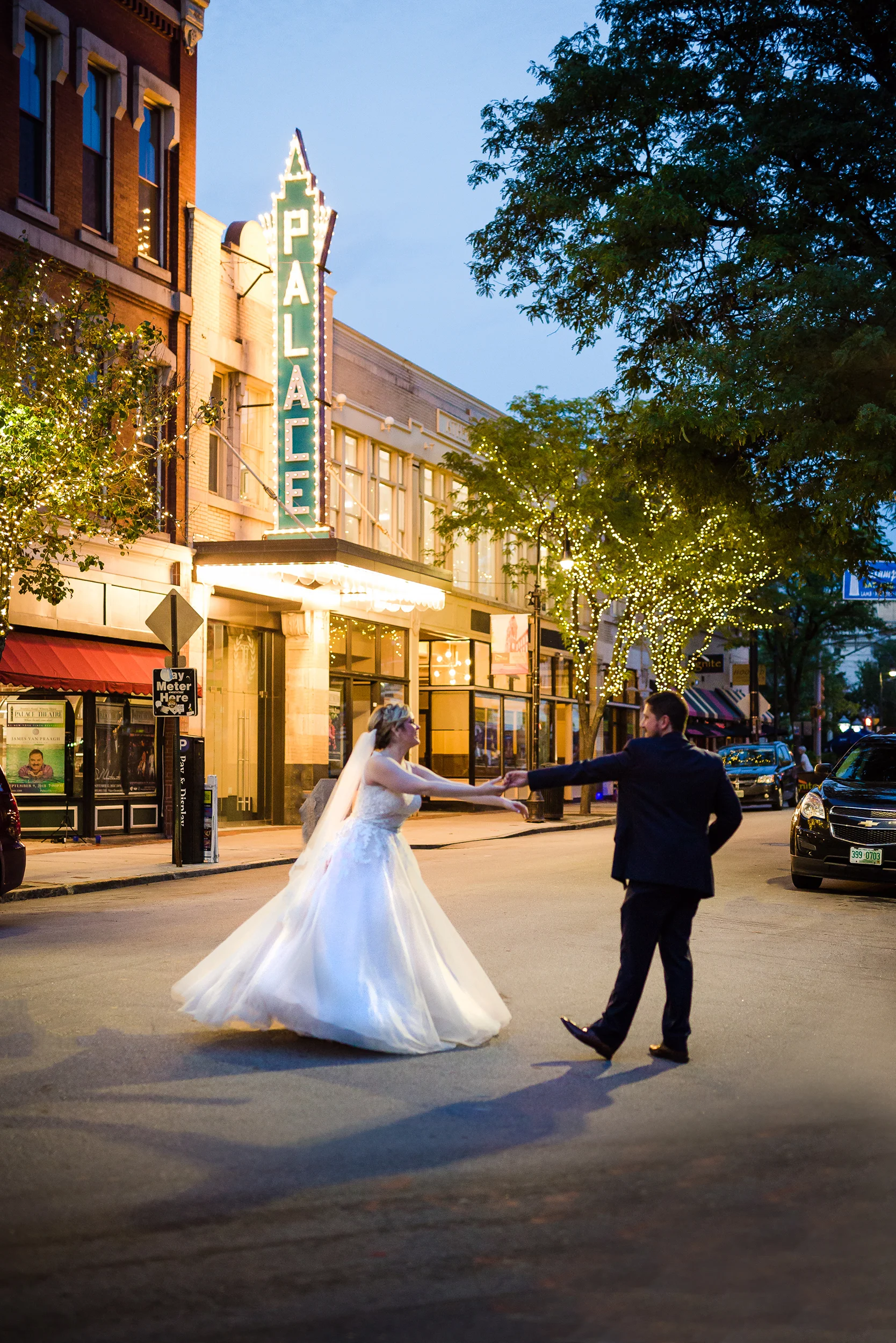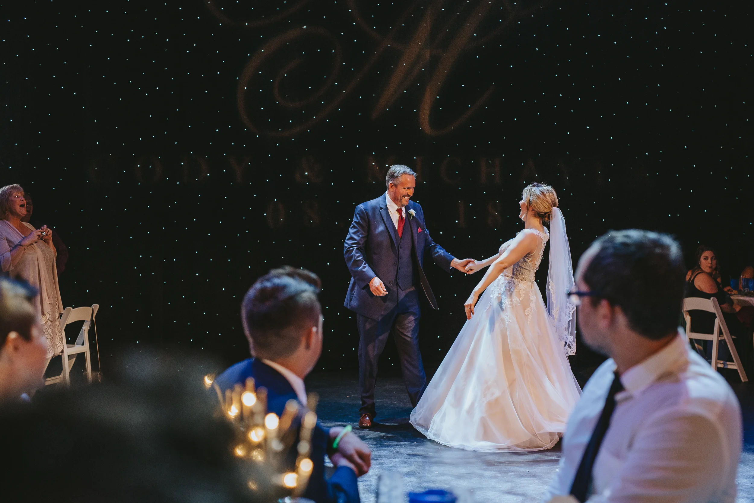 The ceremony took place right on the stage as well, and a quick transformation of the stage during cocktail hour, turned the area into a magical reception space, with artistic lighting, upscale table decor, and a stunning celestial backdrop that tied the overall aesthetic together remarkably well. Intros, toasts, dinner, and dancing followed, culminating with our heading out into the warm, starry, summer evening for some epic night shots in front of the Theatre.
