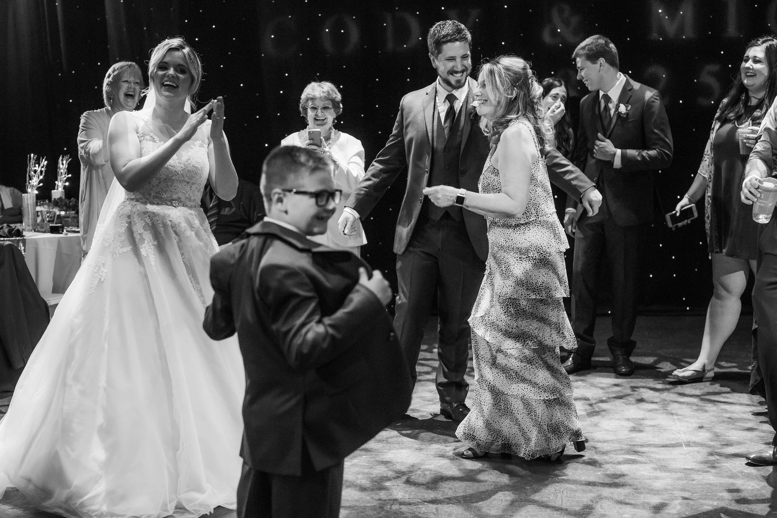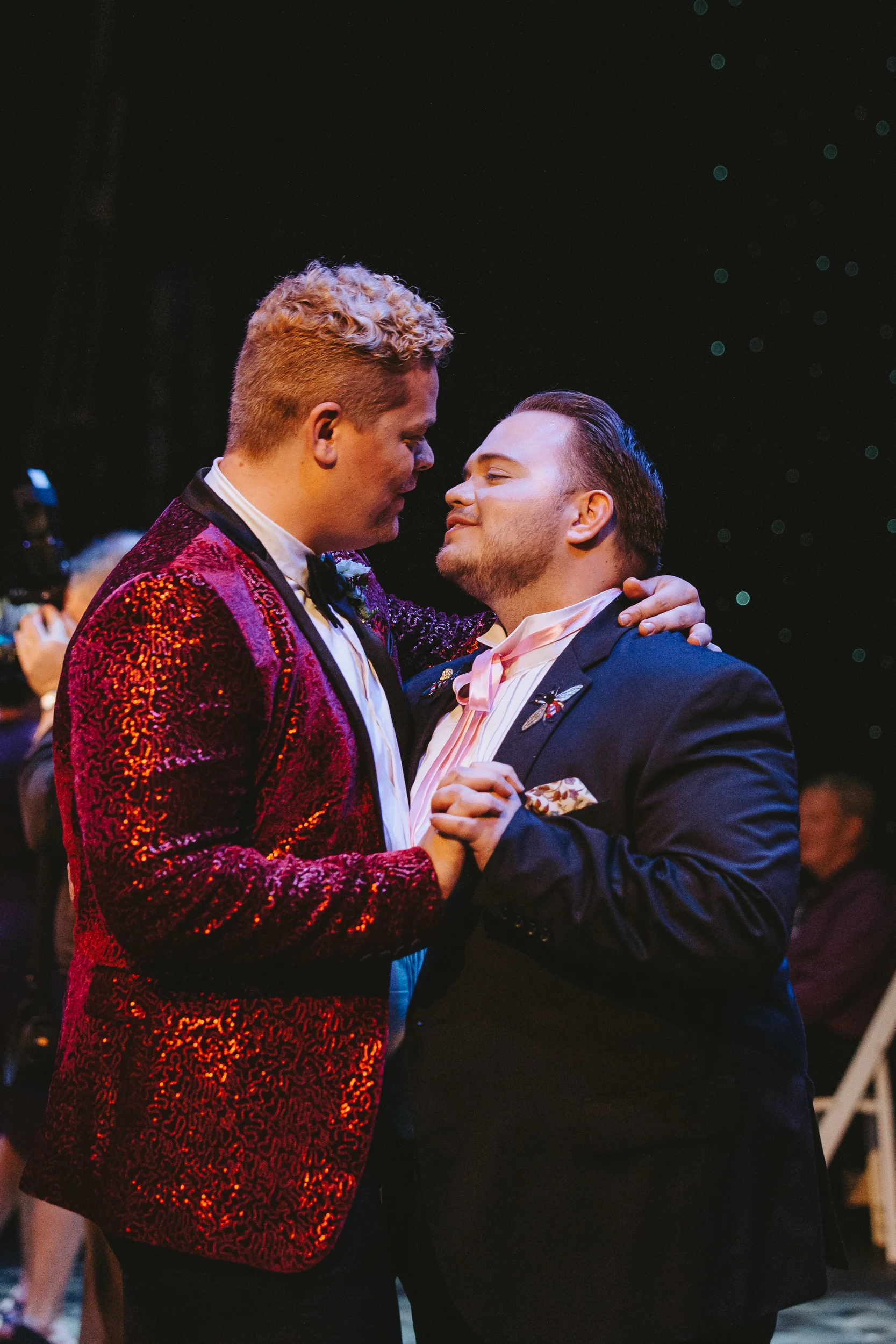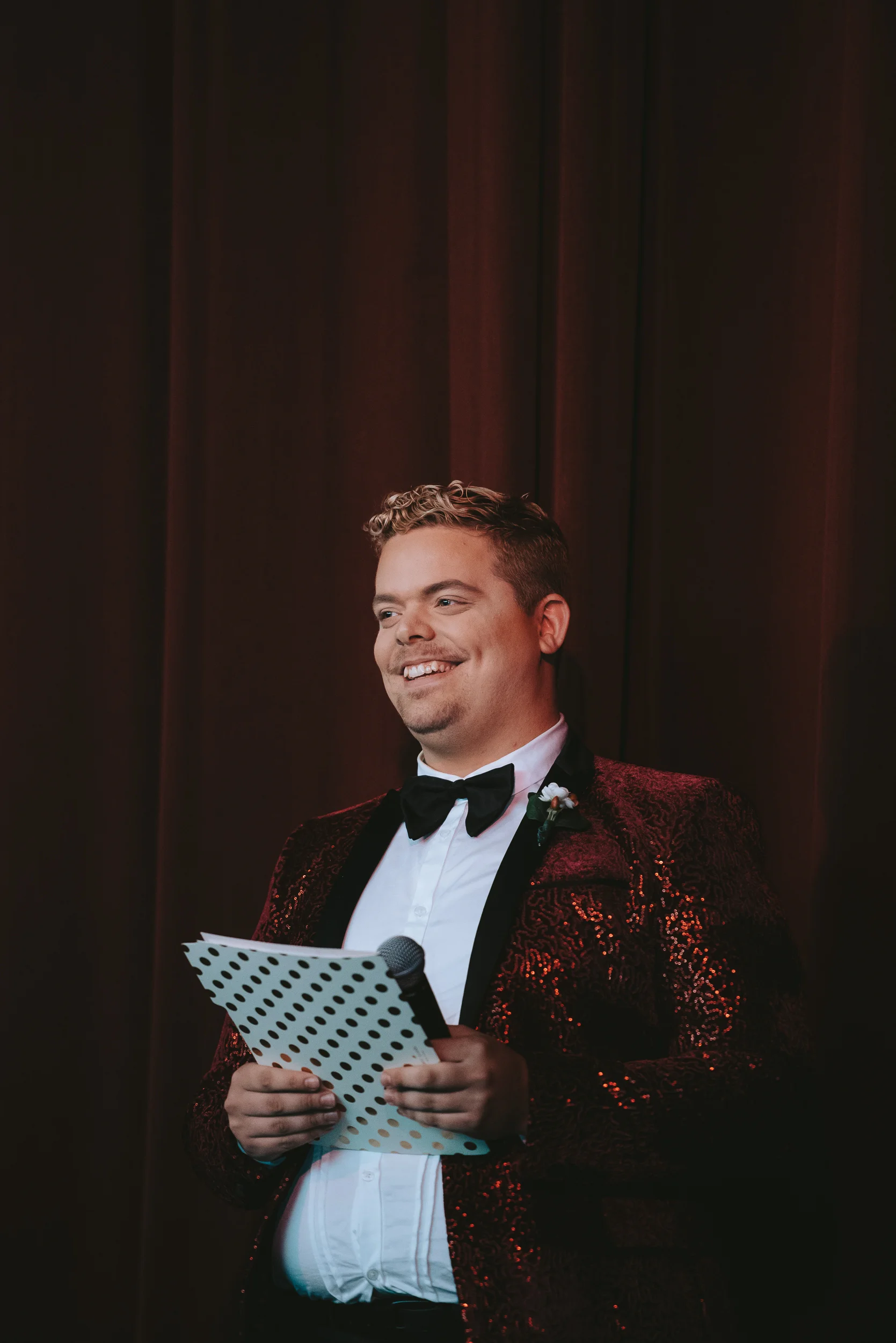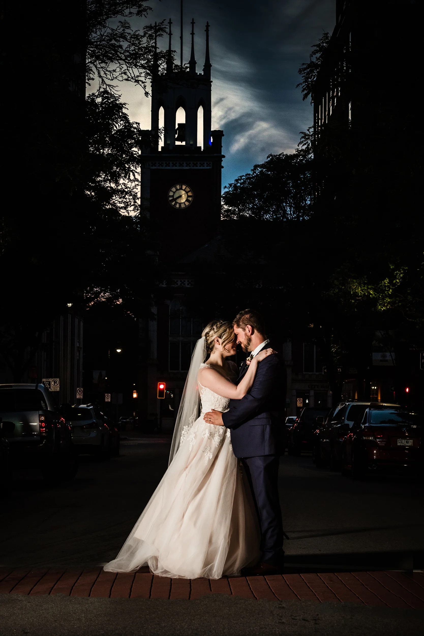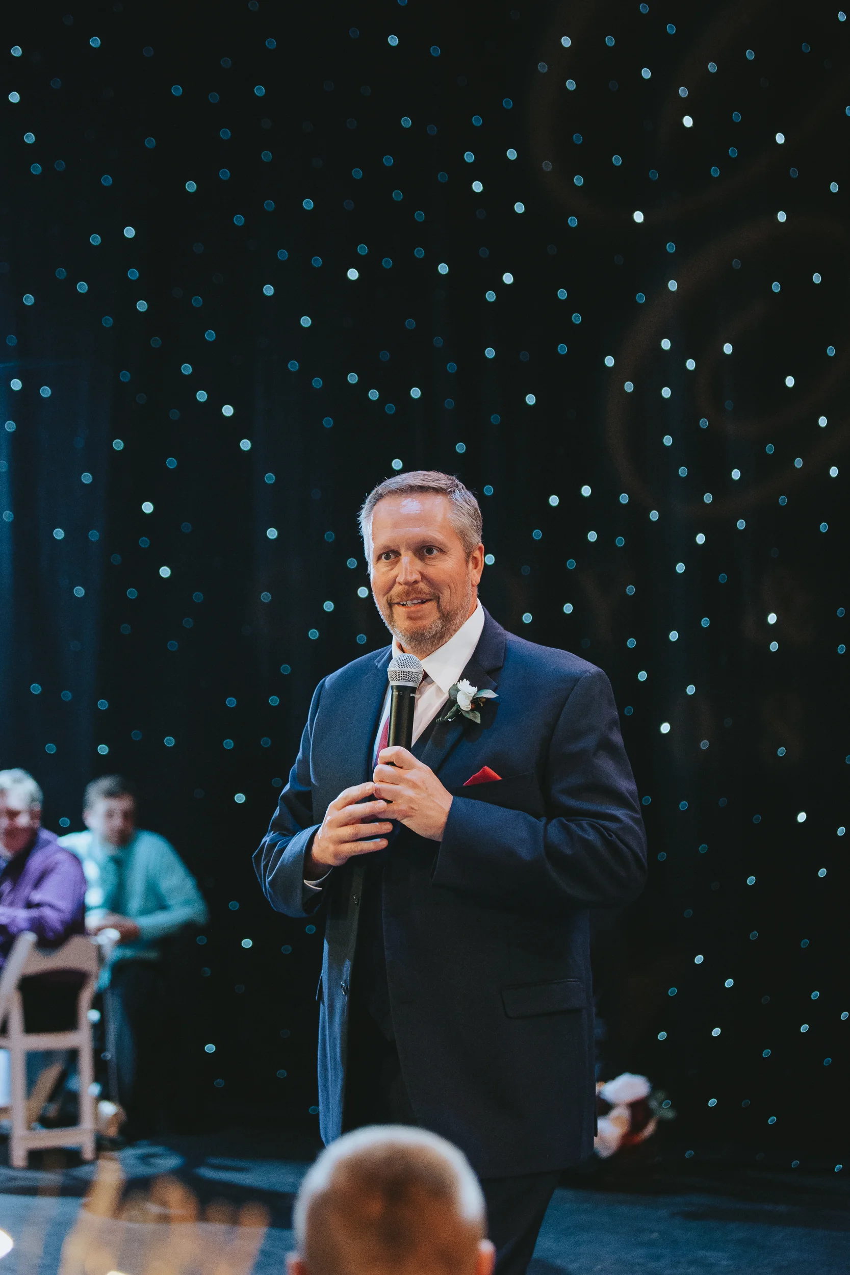 The ceremony took place right on the stage as well, and a quick transformation of the stage during cocktail hour, turned the area into a magical reception space, with artistic lighting, upscale table decor, and a stunning celestial backdrop that tied the overall aesthetic together remarkably well. Intros, toasts, dinner, and dancing followed, culminating with our heading out into the warm, starry, summer evening for some epic night shots in front of the Theatre.