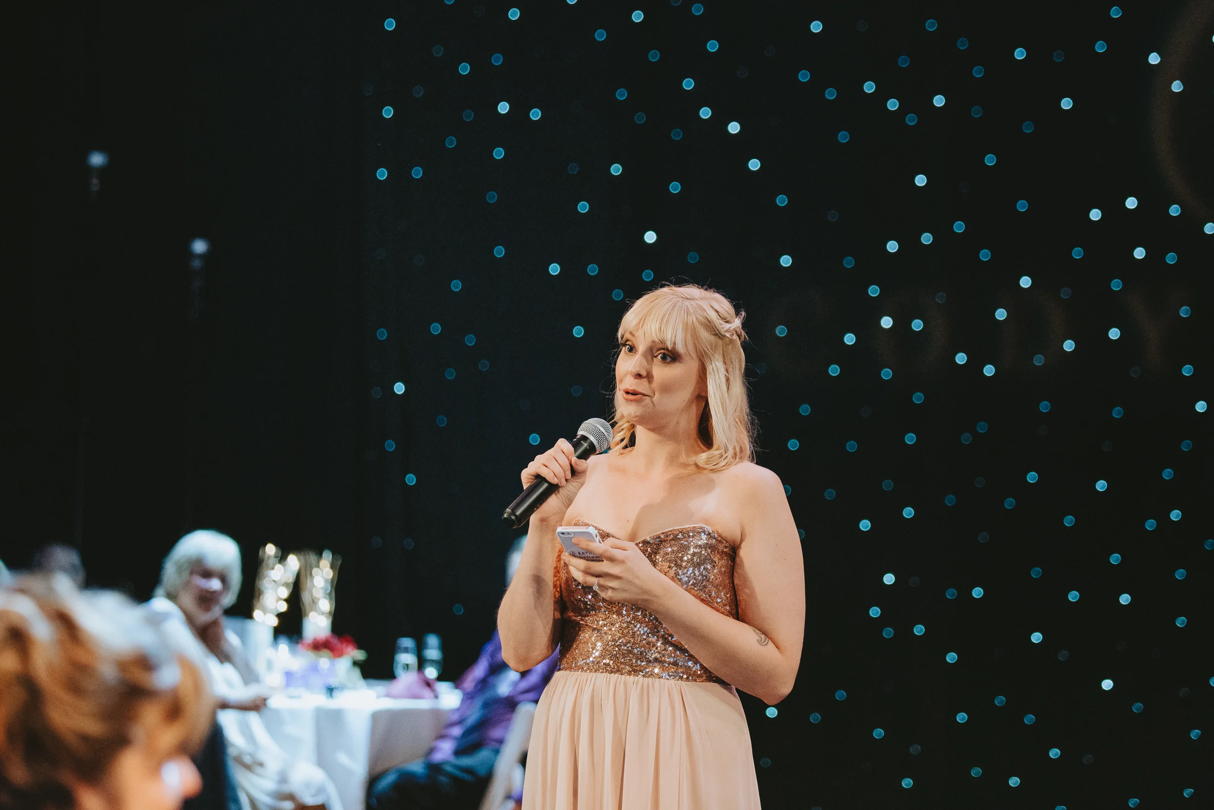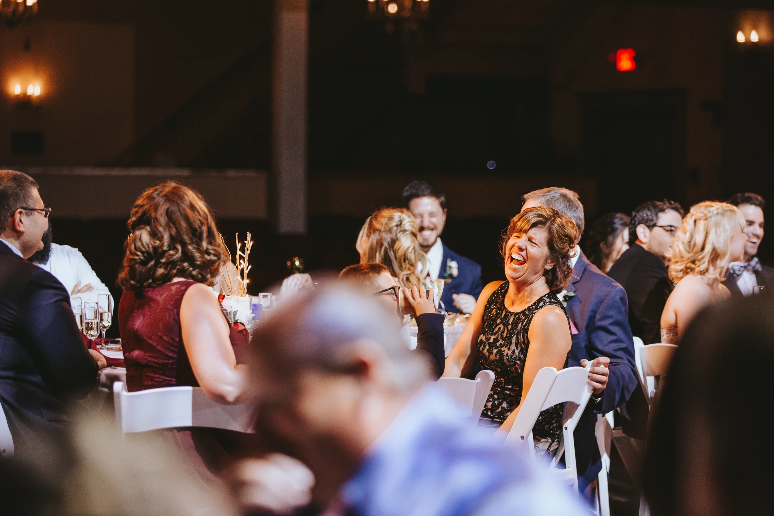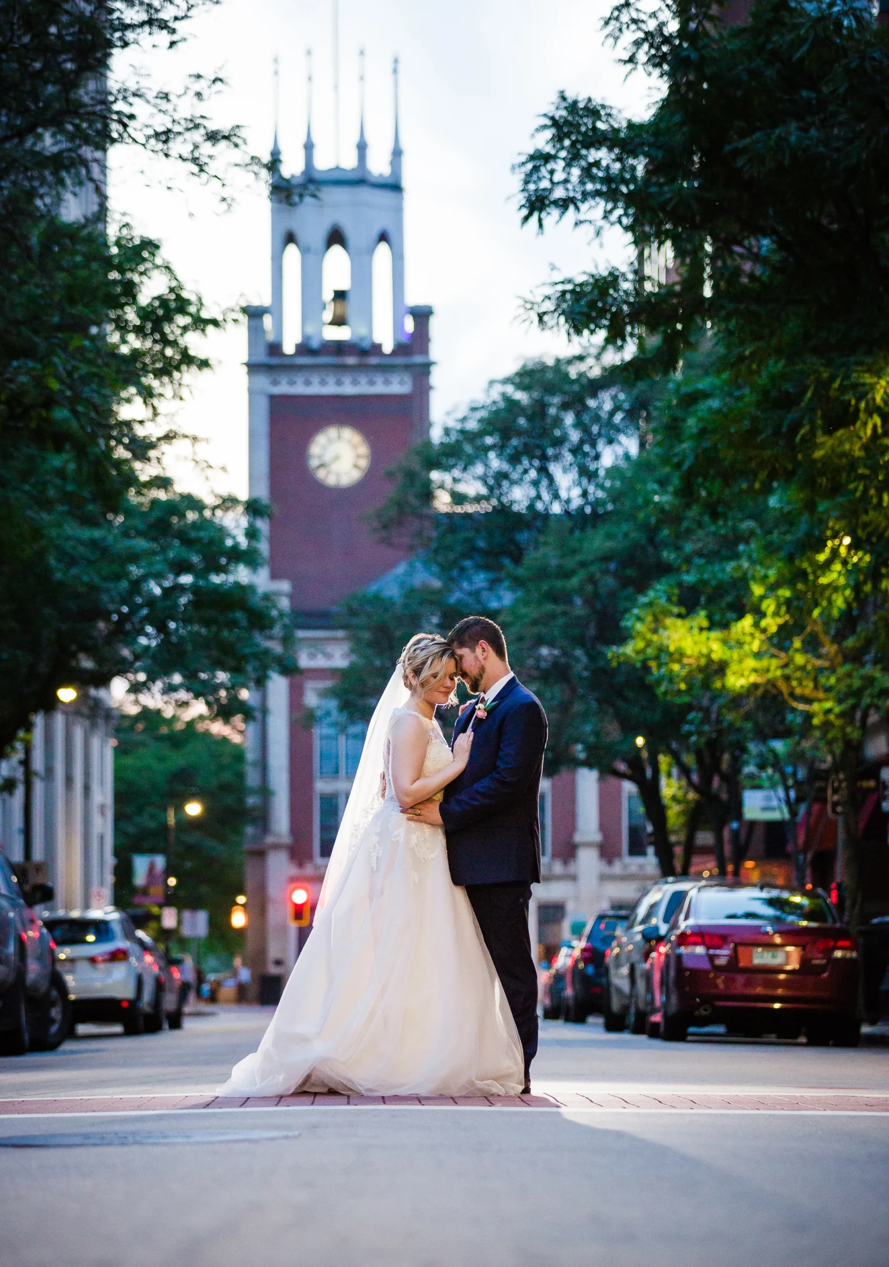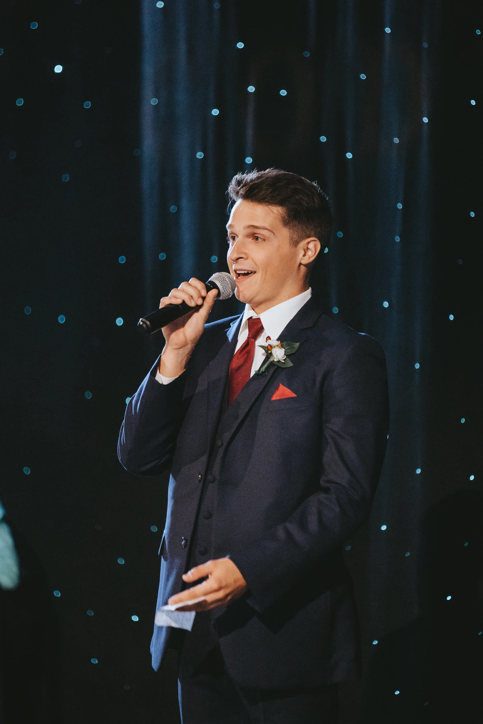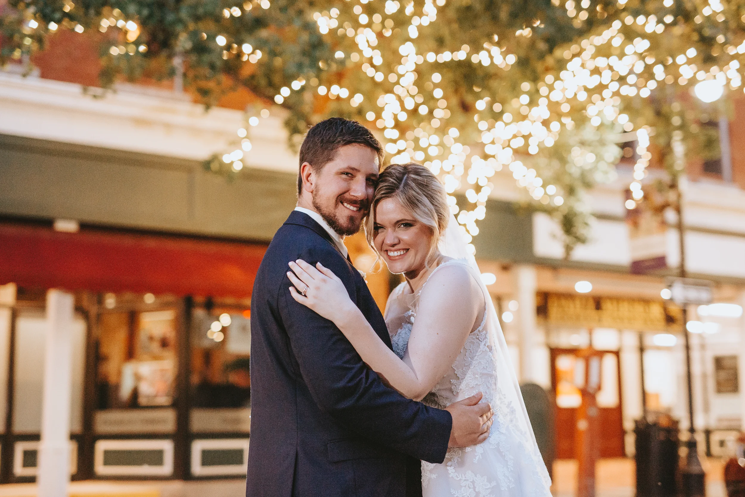 The ceremony took place right on the stage as well, and a quick transformation of the stage during cocktail hour, turned the area into a magical reception space, with artistic lighting, upscale table decor, and a stunning celestial backdrop that tied the overall aesthetic together remarkably well. Intros, toasts, dinner, and dancing followed, culminating with our heading out into the warm, starry, summer evening for some epic night shots in front of the Theatre.