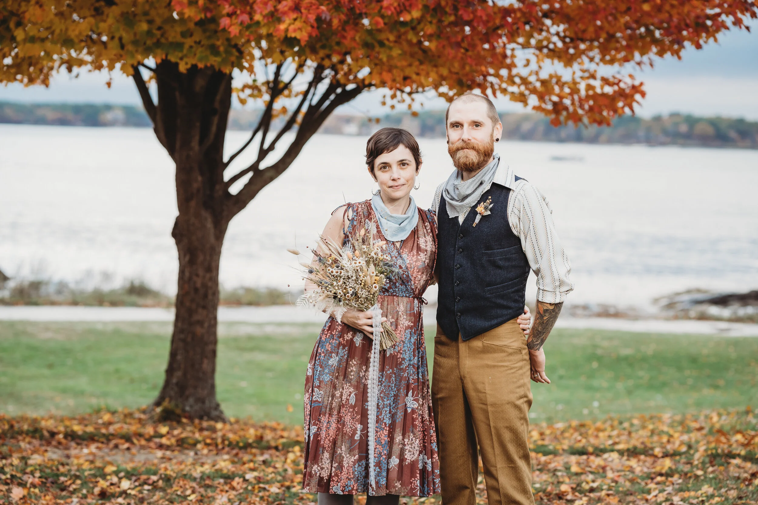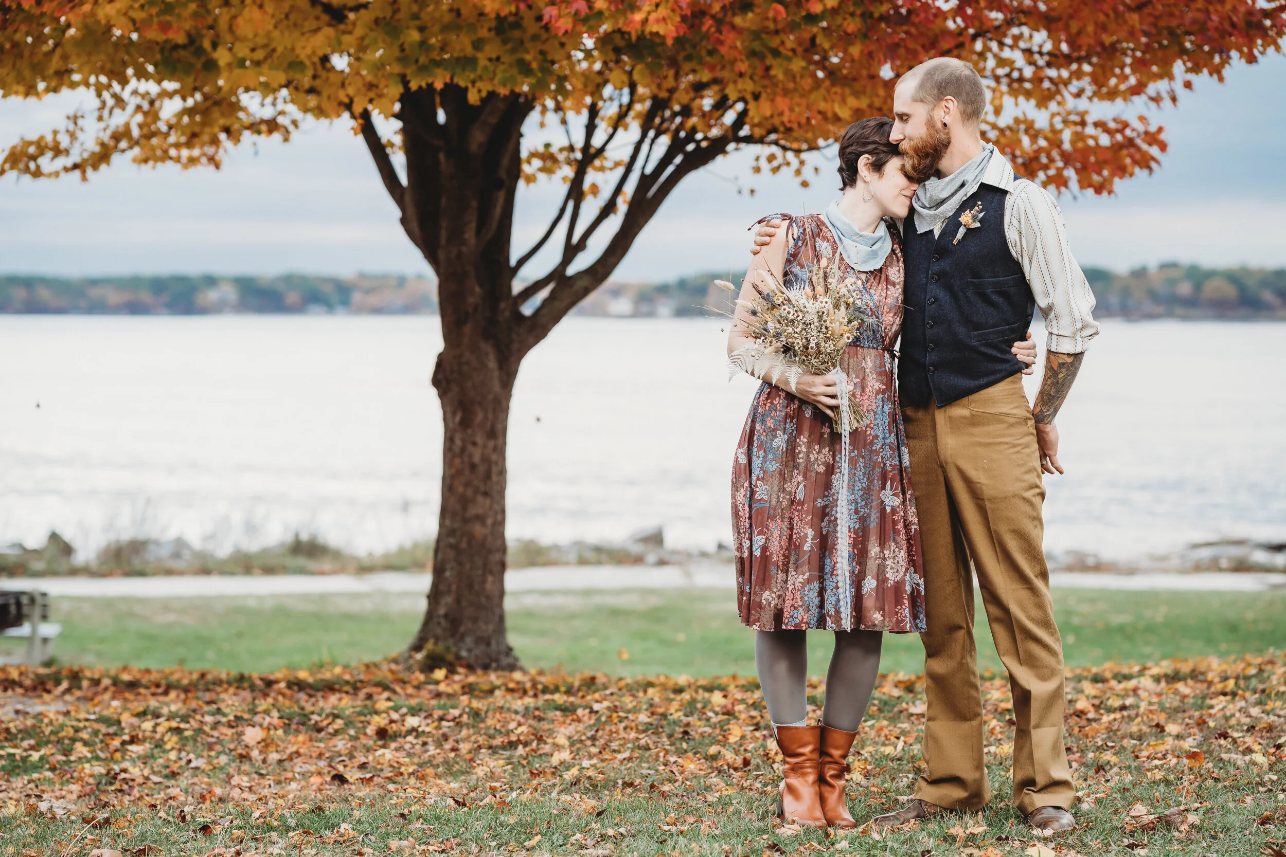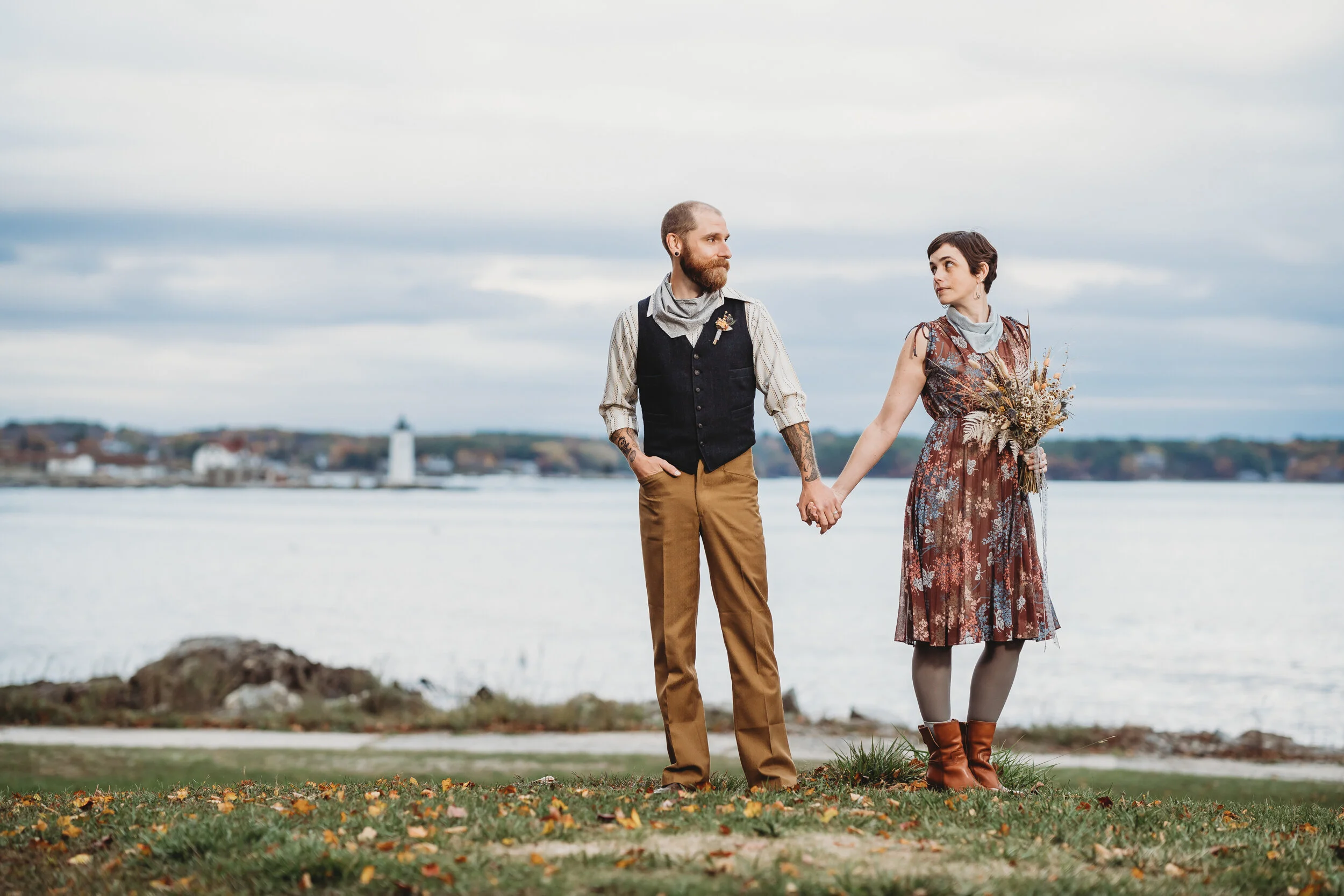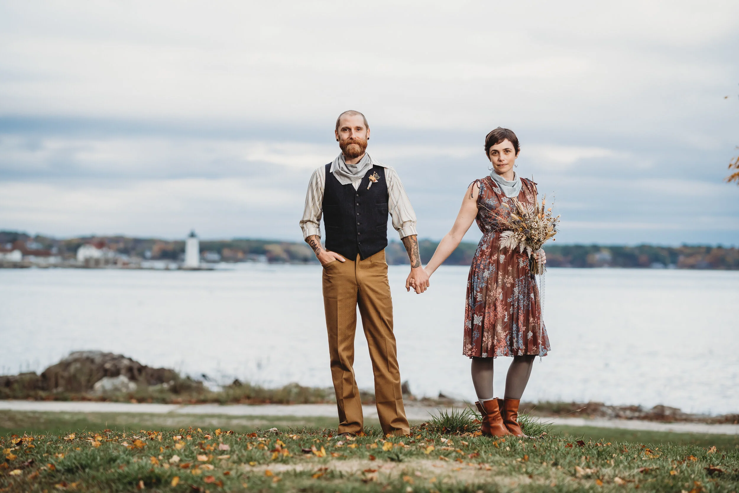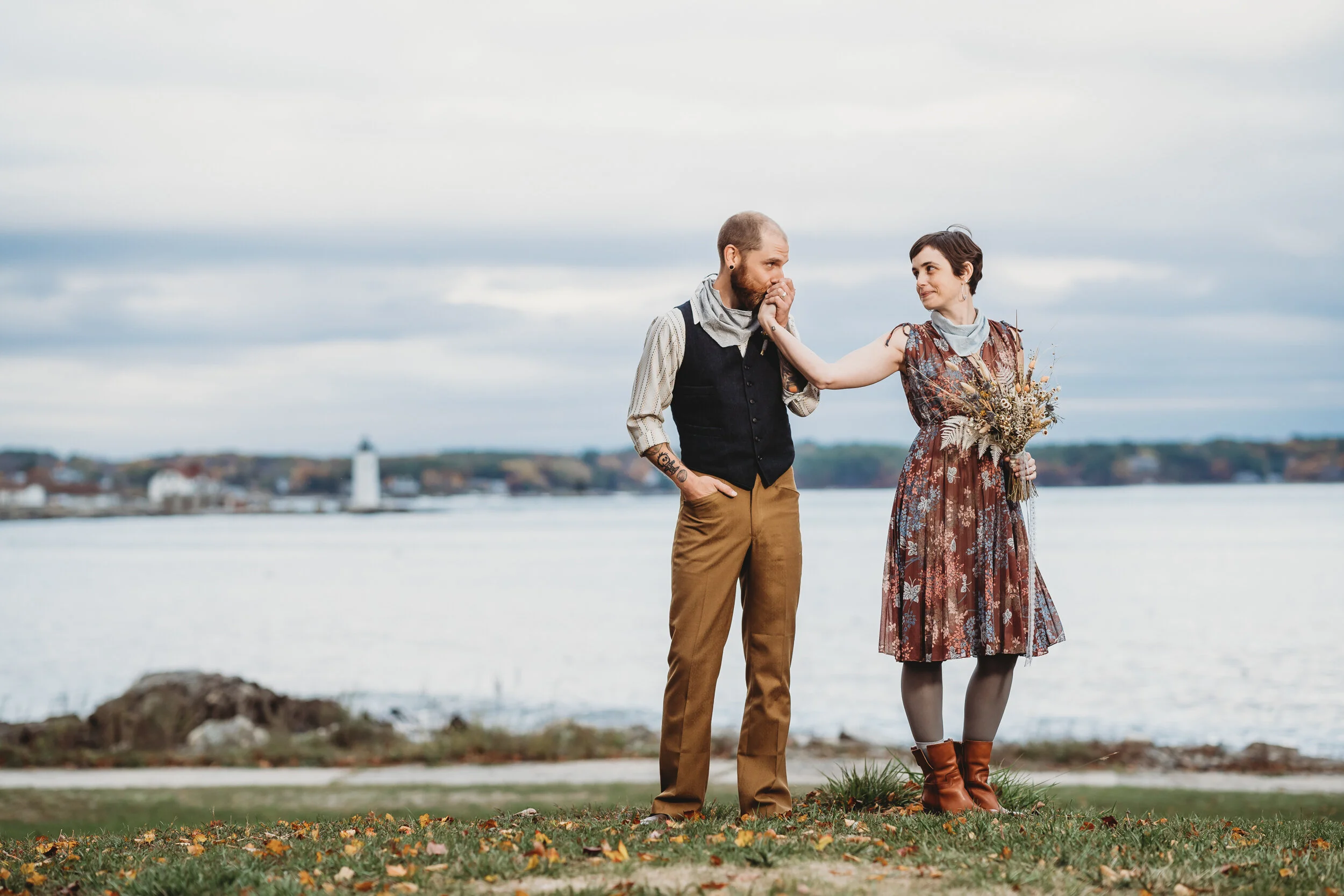Last Saturday (crisp air, peak foliage, slightly overcast) I had a family shoot in Newcastle, NH on Great Island Common. A past wedding couple who now have a baby girl. Fall family photos. All good. Arriving early, I scouted the area looking for interesting light and backdrops. While prepping my gear, a young couple pulled up in the parking lot next to me. Cooly dressed with La Vie Boheme flair, she with dried wildflowers, he with complementary boutonnière, it became clear that they had arrived to be married. As a wedding photographer, I immediately took a keen interest in the couple. Allowing them time to unpack, I introduced myself to them, and asked if they were getting married. Indeed they were. Andy and Kim had traveled up from Rhode Island for the express purpose of becoming husband and wife; a modest, yet heartfelt seaside ceremony with a handful of friends looking on was their goal. I told them I happened to be a wedding photographer and that I would be more than happy to capture a few portraits of them once I was through with my family shoot.