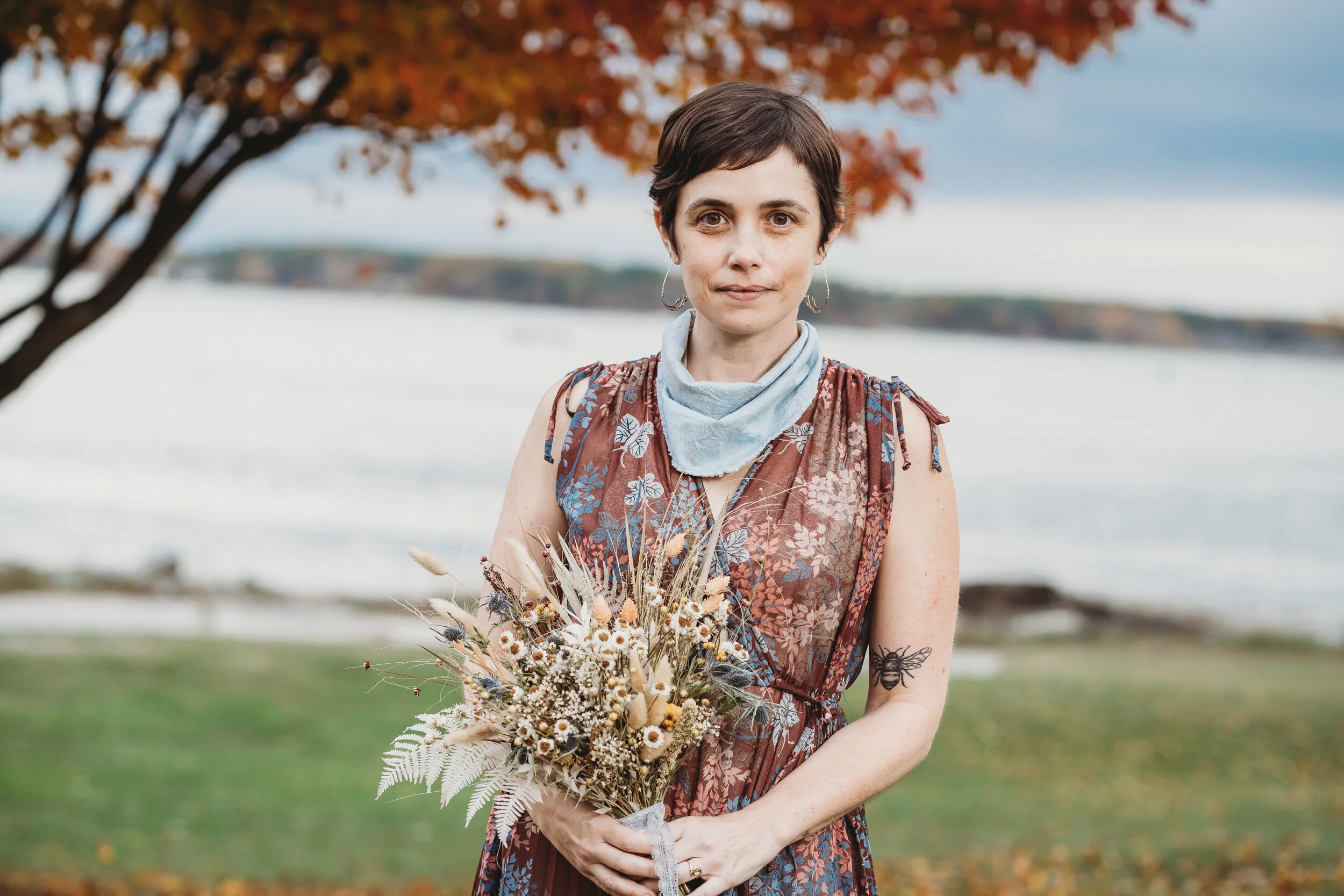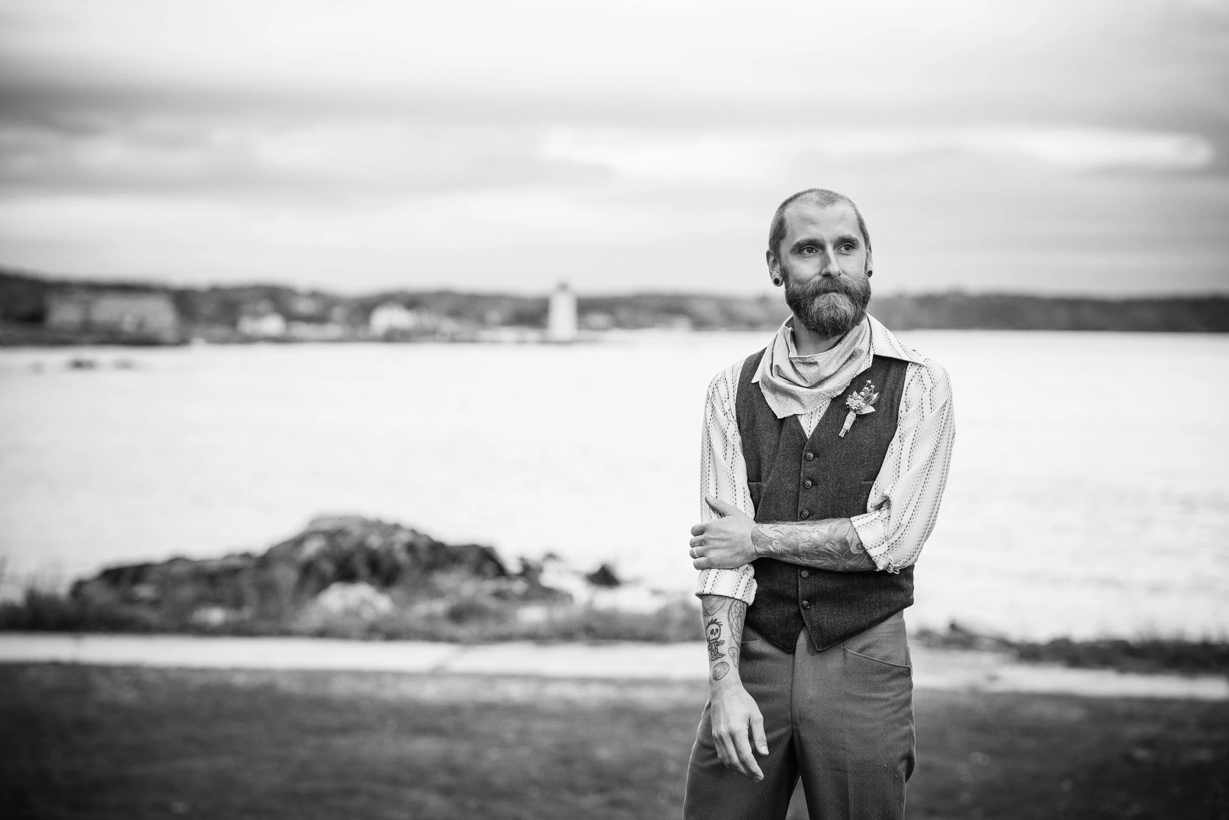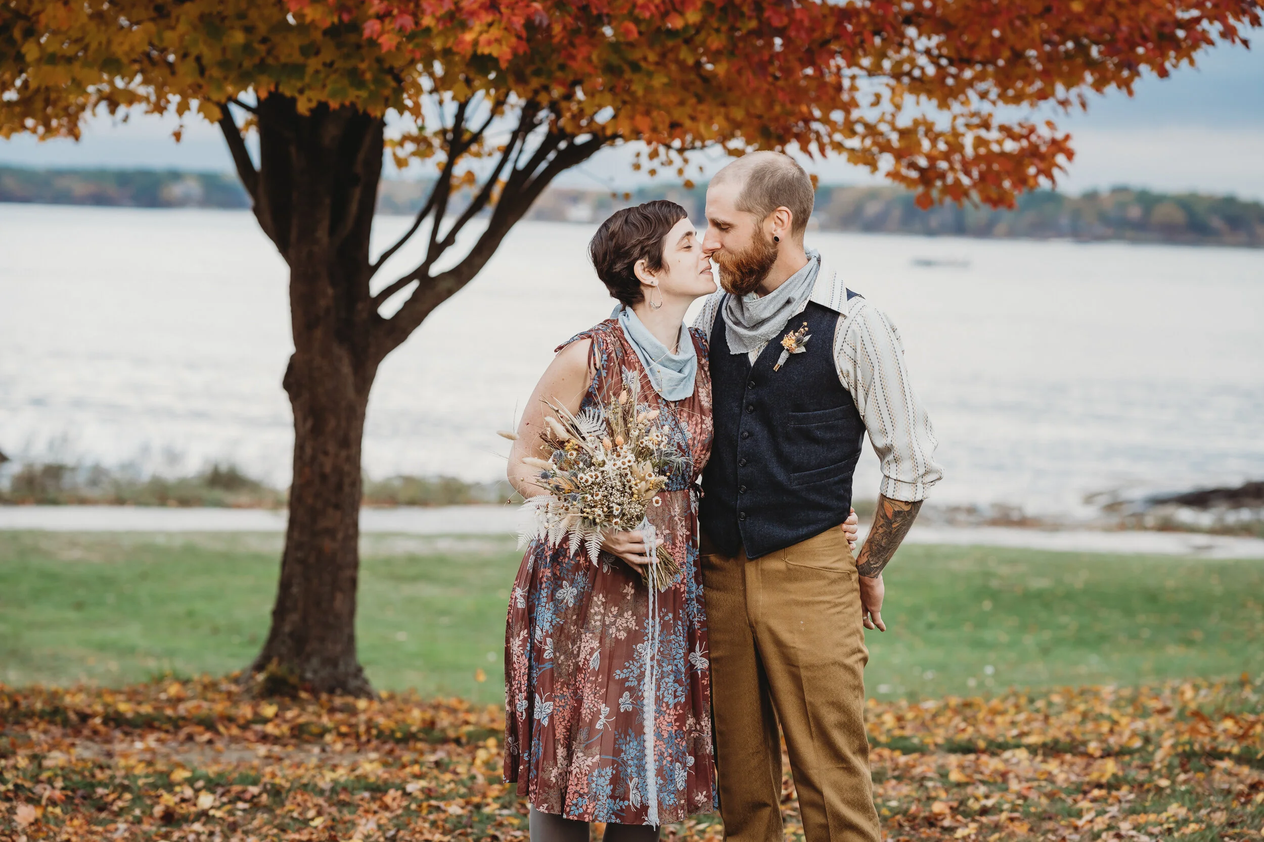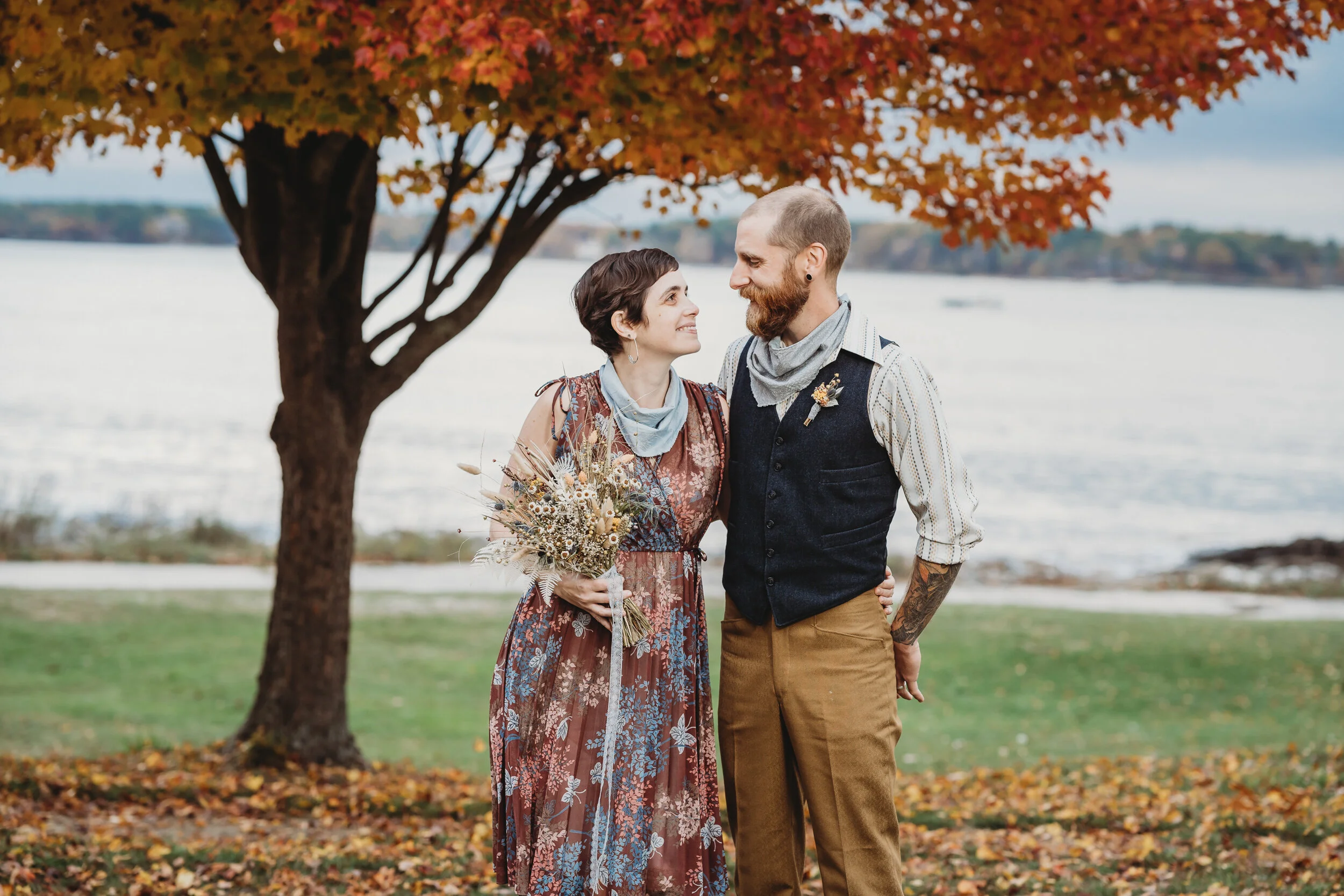 Last Saturday (crisp air, peak foliage, slightly overcast) I had a family shoot in Newcastle, NH on Great Island Common. A past wedding couple who now have a baby girl. Fall family photos. All good. Arriving early, I scouted the area looking for interesting light and backdrops. While prepping my gear, a young couple pulled up in the parking lot next to me. Cooly dressed with La Vie Boheme flair, she with dried wildflowers, he with complementary boutonnière, it became clear that they had arrived to be married. As a wedding photographer, I immediately took a keen interest in the couple. Allowing them time to unpack, I introduced myself to them, and asked if they were getting married. Indeed they were. Andy and Kim had traveled up from Rhode Island for the express purpose of becoming husband and wife; a modest, yet heartfelt seaside ceremony with a handful of friends looking on was their goal. I told them I happened to be a wedding photographer and that I would be more than happy to capture a few portraits of them once I was through with my family shoot.