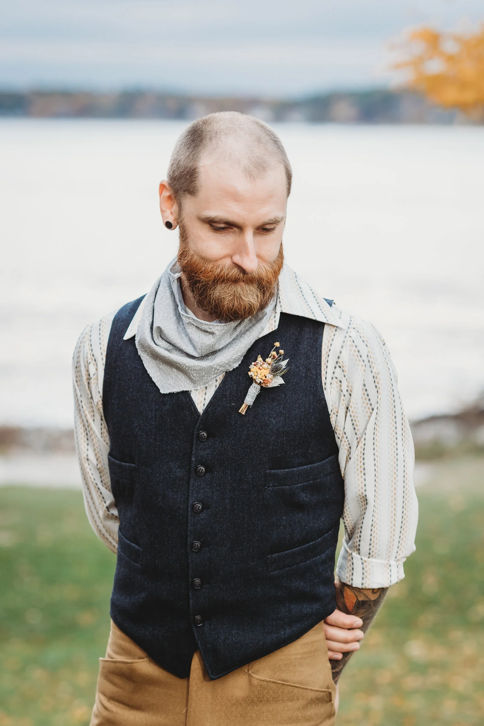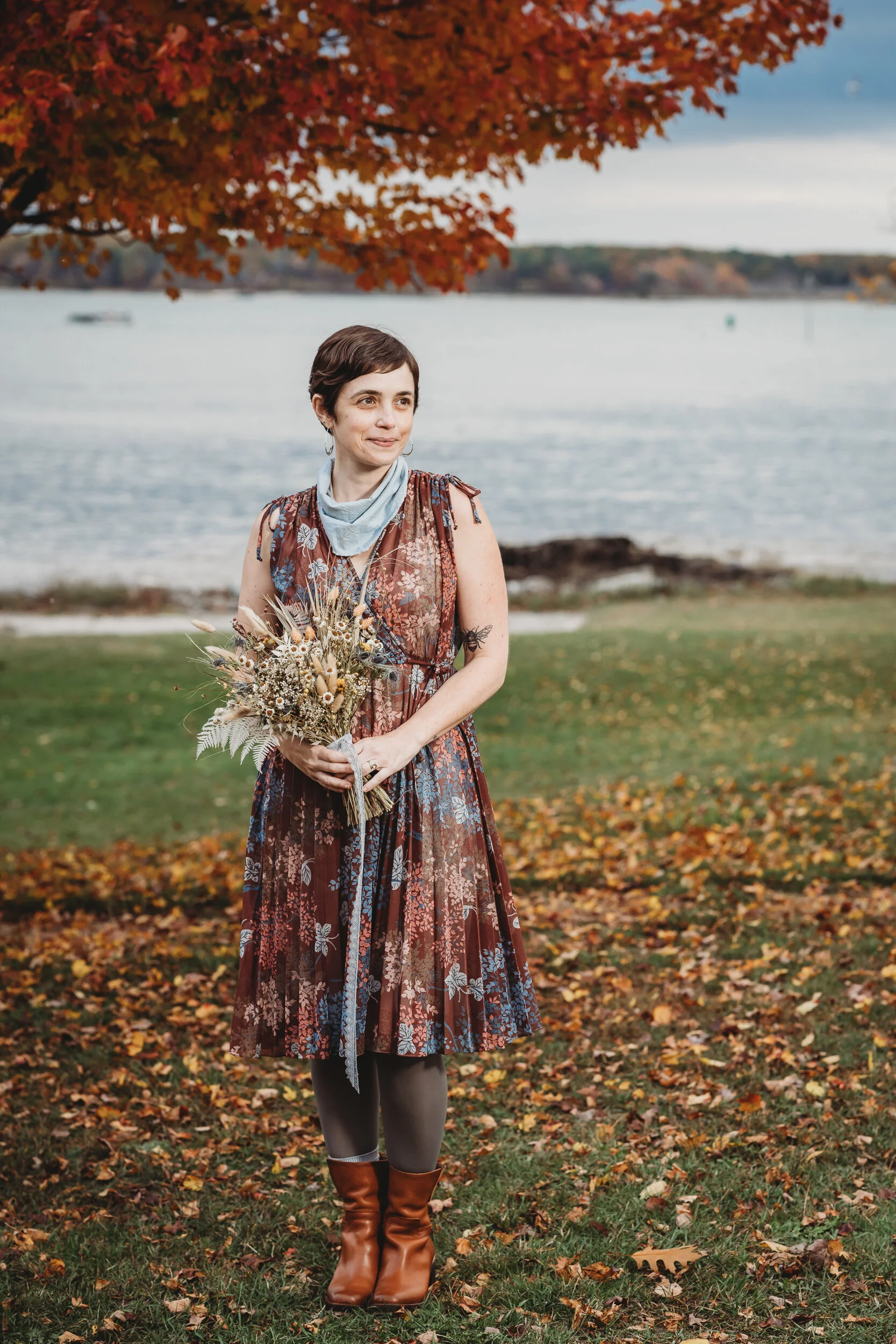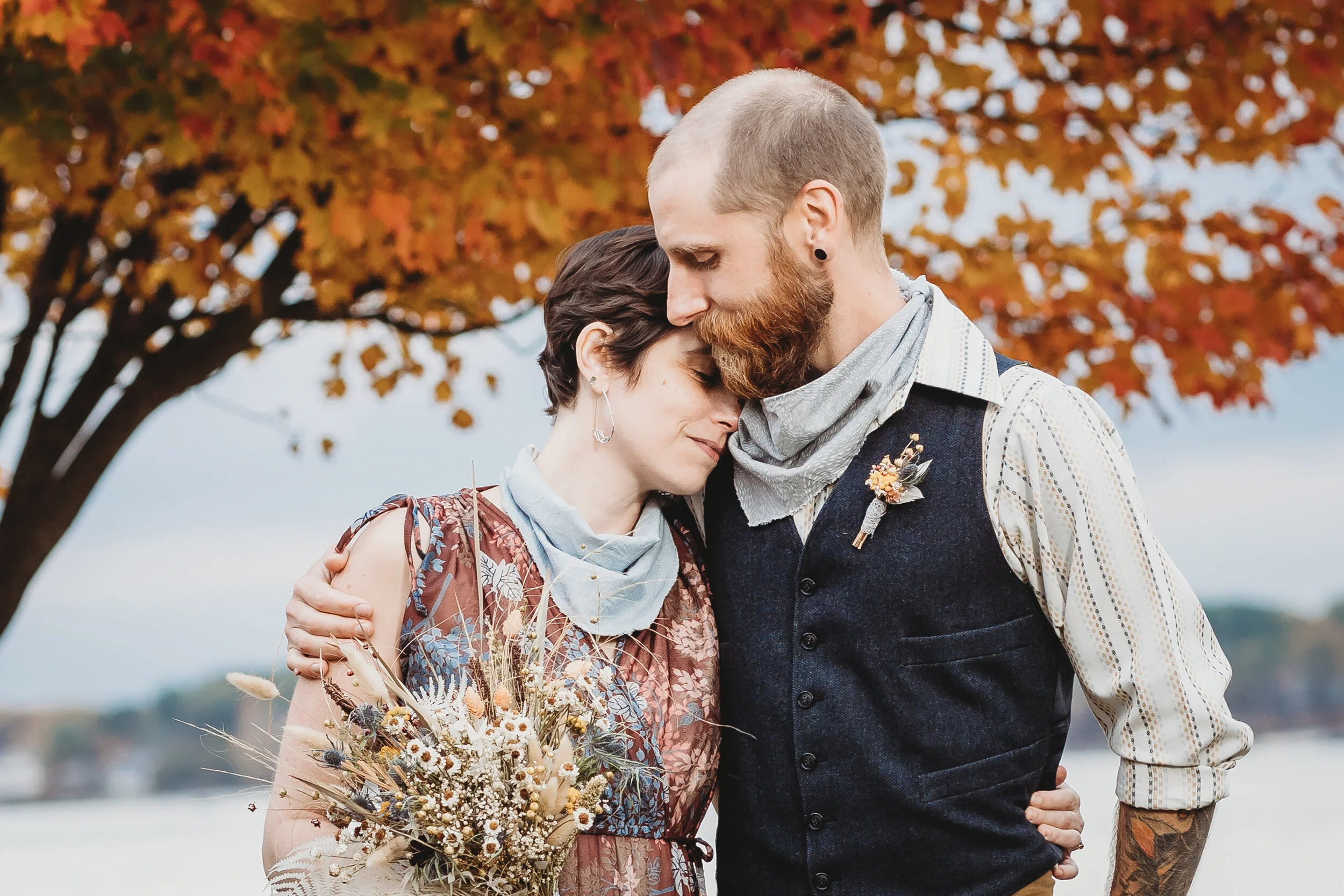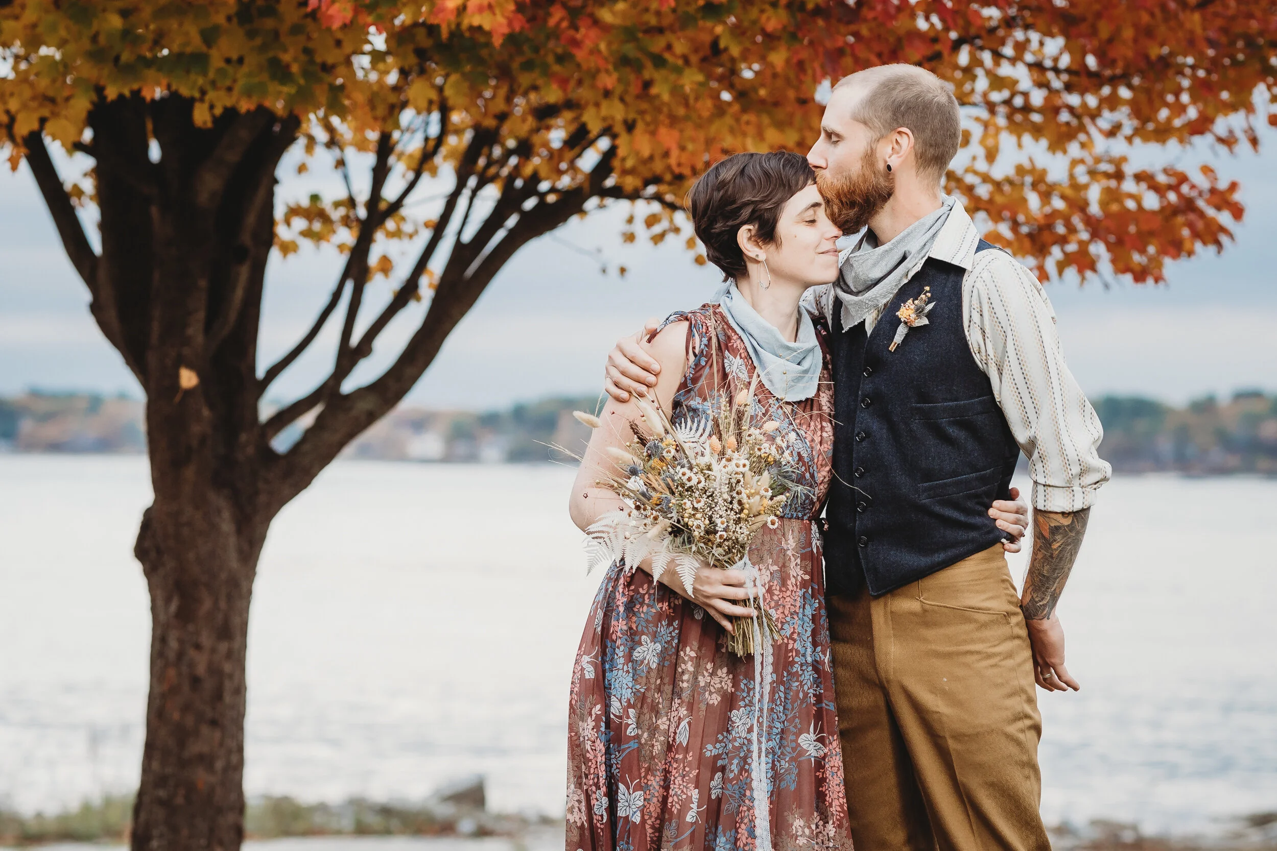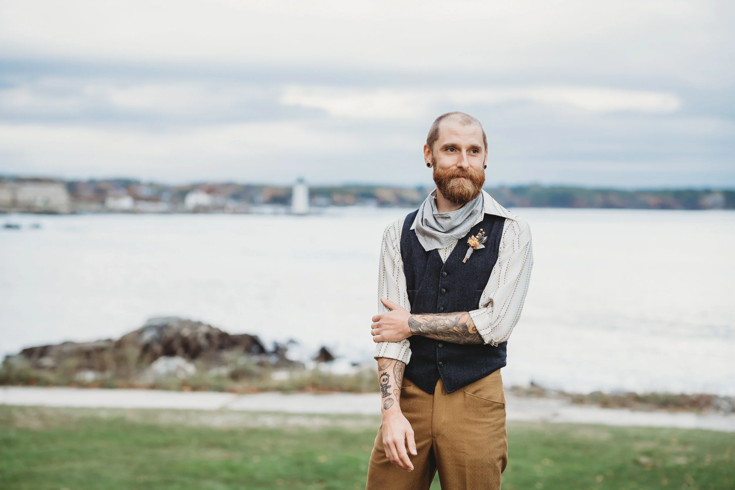 Last Saturday (crisp air, peak foliage, slightly overcast) I had a family shoot in Newcastle, NH on Great Island Common. A past wedding couple who now have a baby girl. Fall family photos. All good. Arriving early, I scouted the area looking for interesting light and backdrops. While prepping my gear, a young couple pulled up in the parking lot next to me. Cooly dressed with La Vie Boheme flair, she with dried wildflowers, he with complementary boutonnière, it became clear that they had arrived to be married. As a wedding photographer, I immediately took a keen interest in the couple. Allowing them time to unpack, I introduced myself to them, and asked if they were getting married. Indeed they were. Andy and Kim had traveled up from Rhode Island for the express purpose of becoming husband and wife; a modest, yet heartfelt seaside ceremony with a handful of friends looking on was their goal. I told them I happened to be a wedding photographer and that I would be more than happy to capture a few portraits of them once I was through with my family shoot.