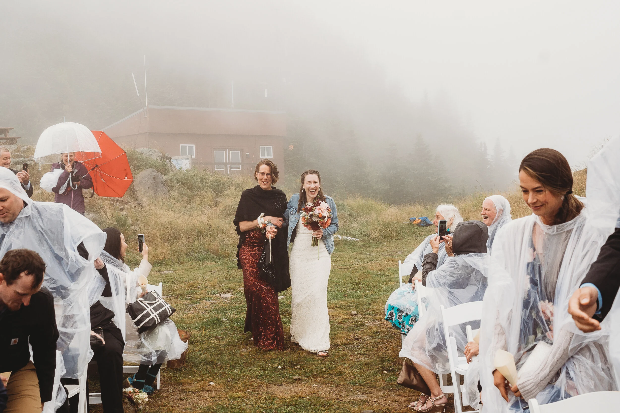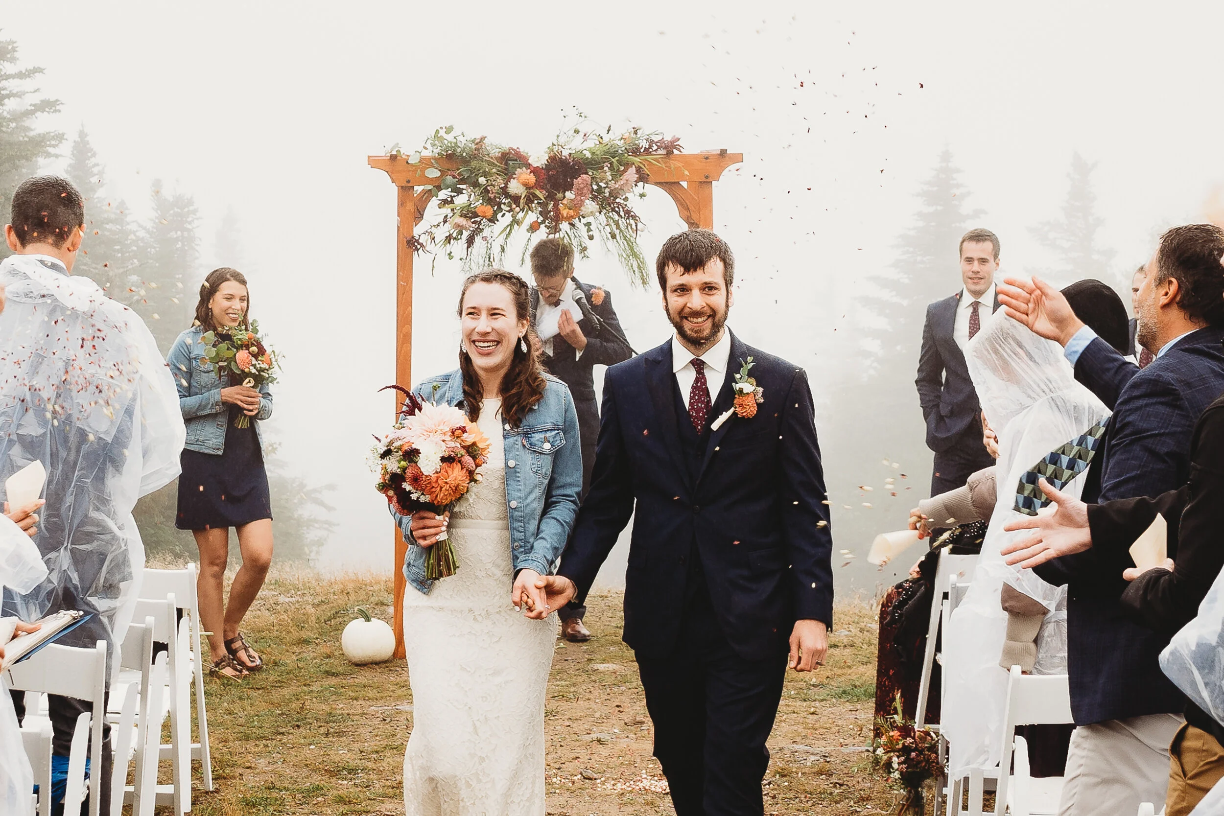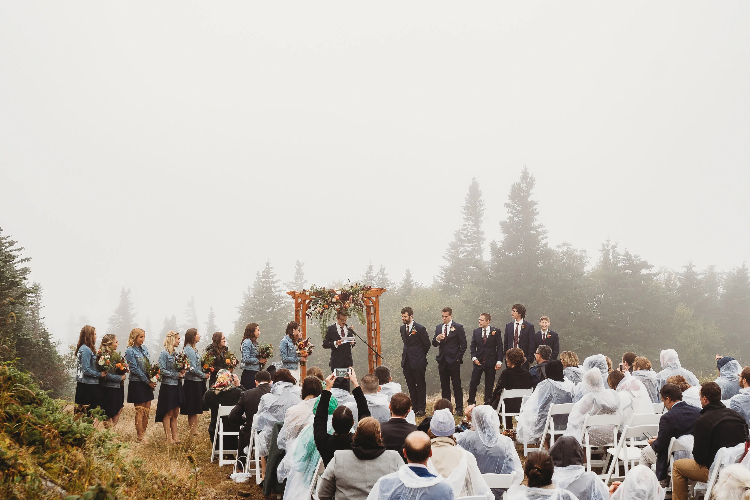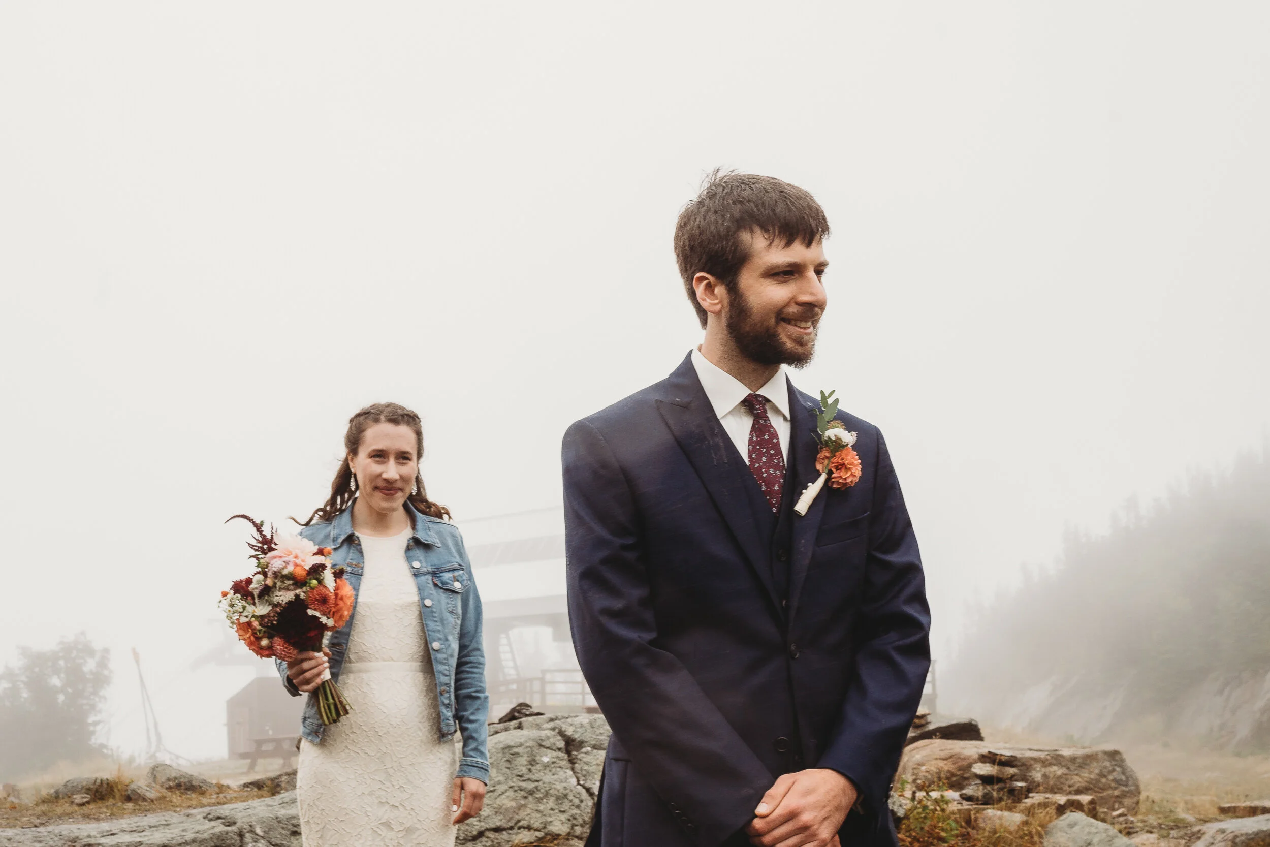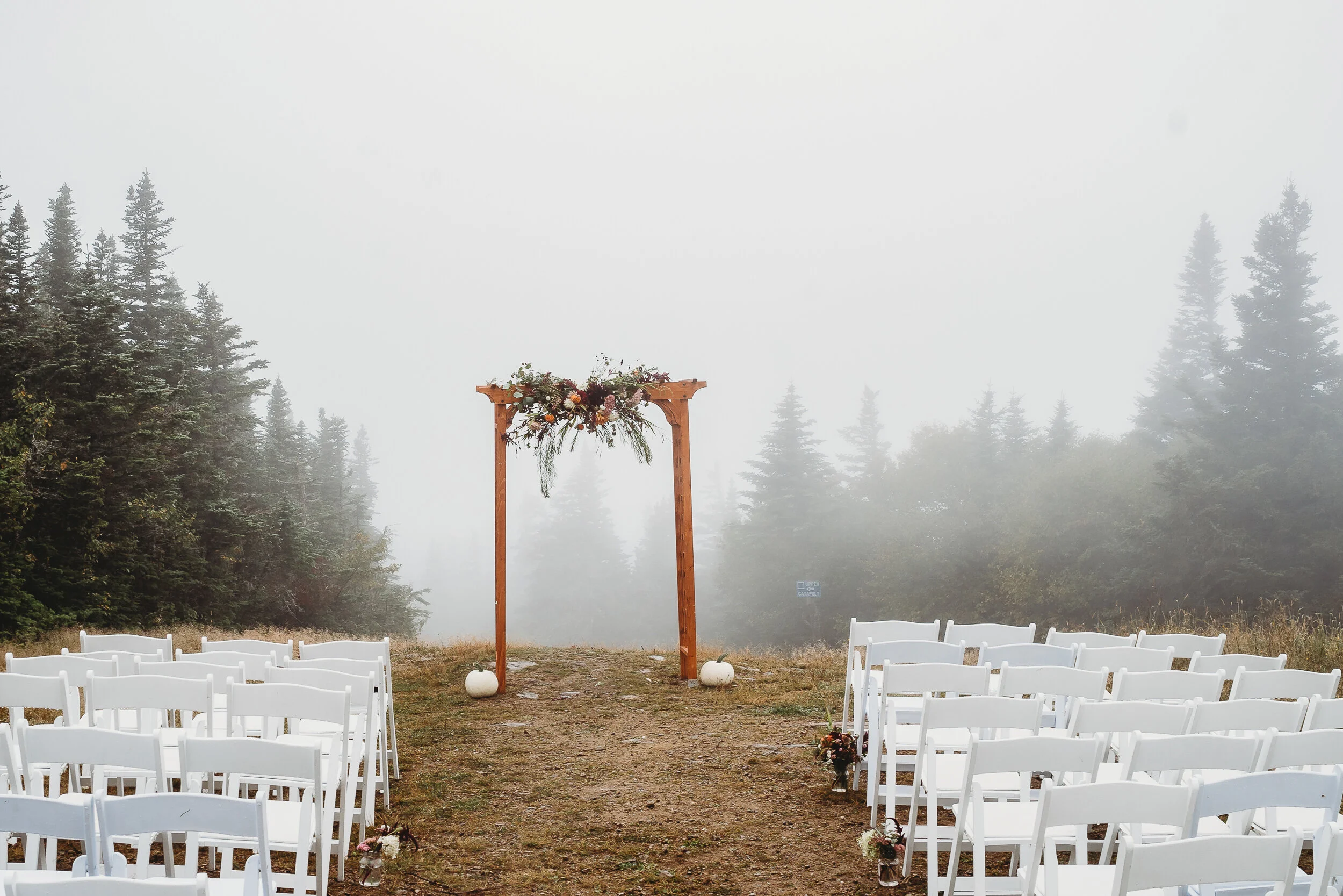 Britta and Brian were married on Saturday September 14, 2019 on the tippity-top of a incredibly foggy, wind-swept Wildcat Mountain in Pinkham Notch, NH which is located in the White Mountain National Forest across from Mount Washington. Despite inclement (and sometimes turbulent!) weather, their ceremony was absolutely epic, and a veritable Ulyssian adventure for all in attendance. Guests journeyed to the top of the mountain via gondolas through heavy winds, donning the readily supplied rain ponchos in anticipation of their ceremony. One had the distinct feeling that we were all in this together, witnessing something unique and memorable, knowing full well that we would all be left better for having experienced it. It was that kind of epicness that I struggle to convey with words, so make sure to check out the photos below! Thanks so much for allowing me to capture these memories for you Britta & Brian!