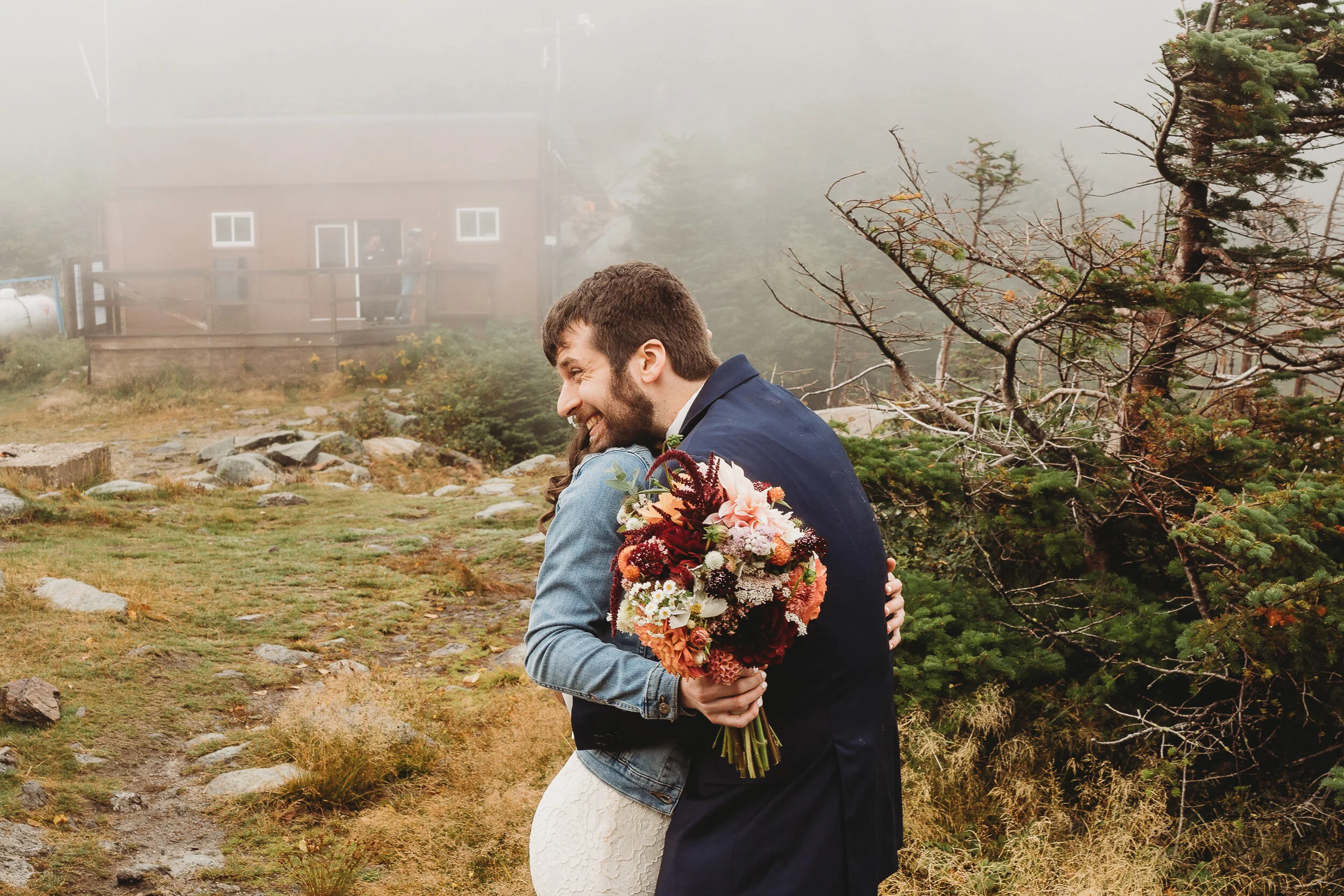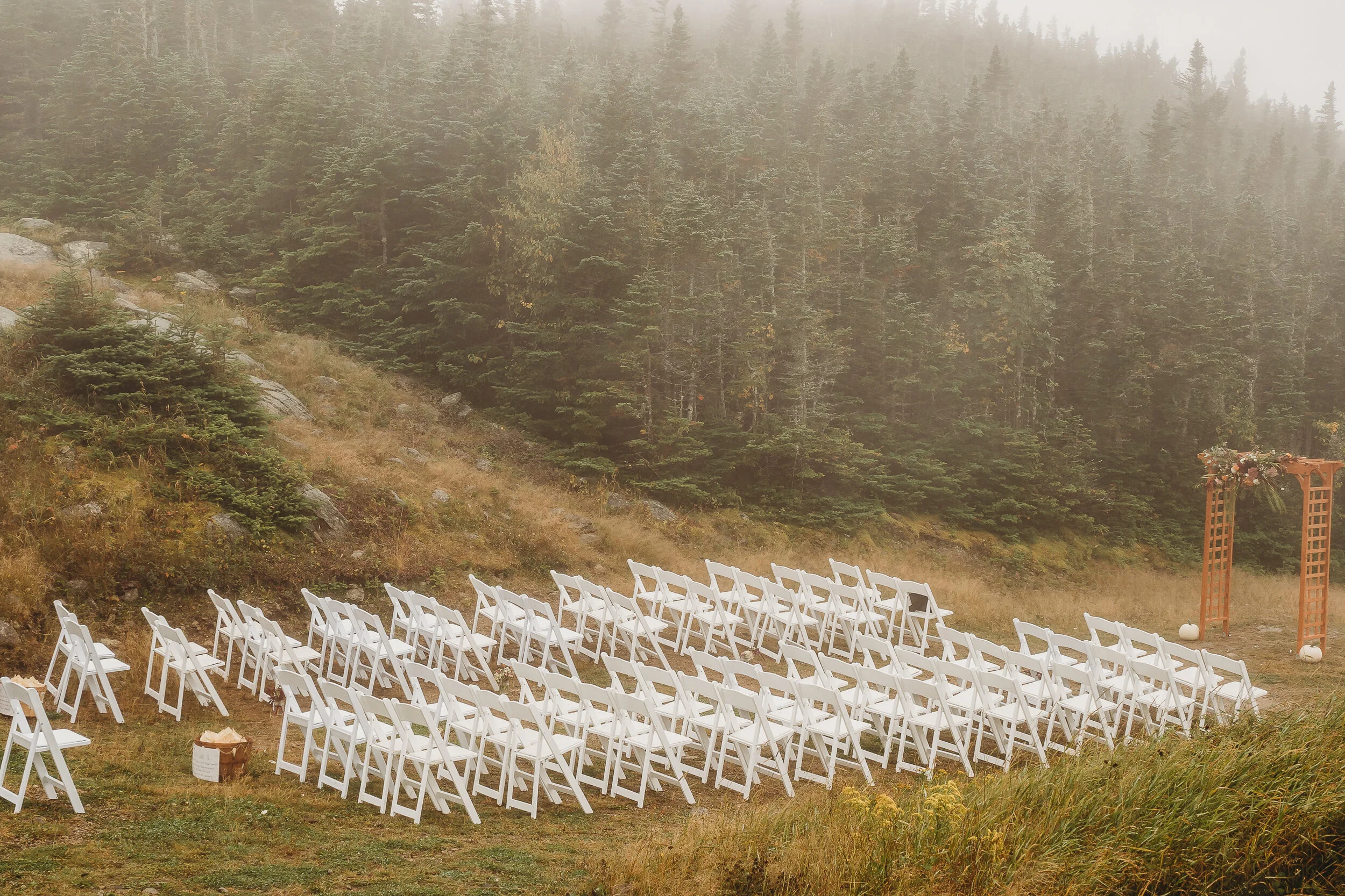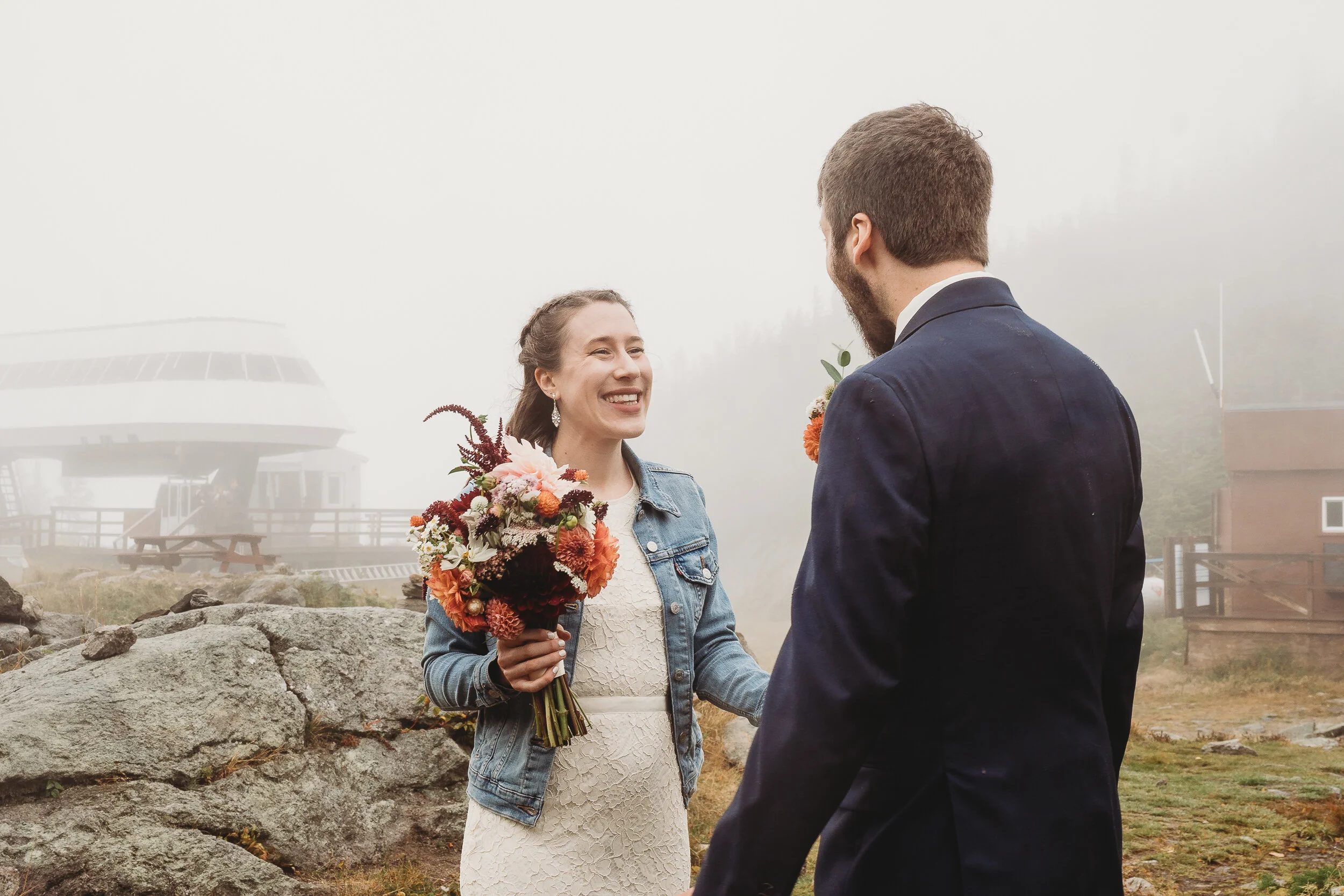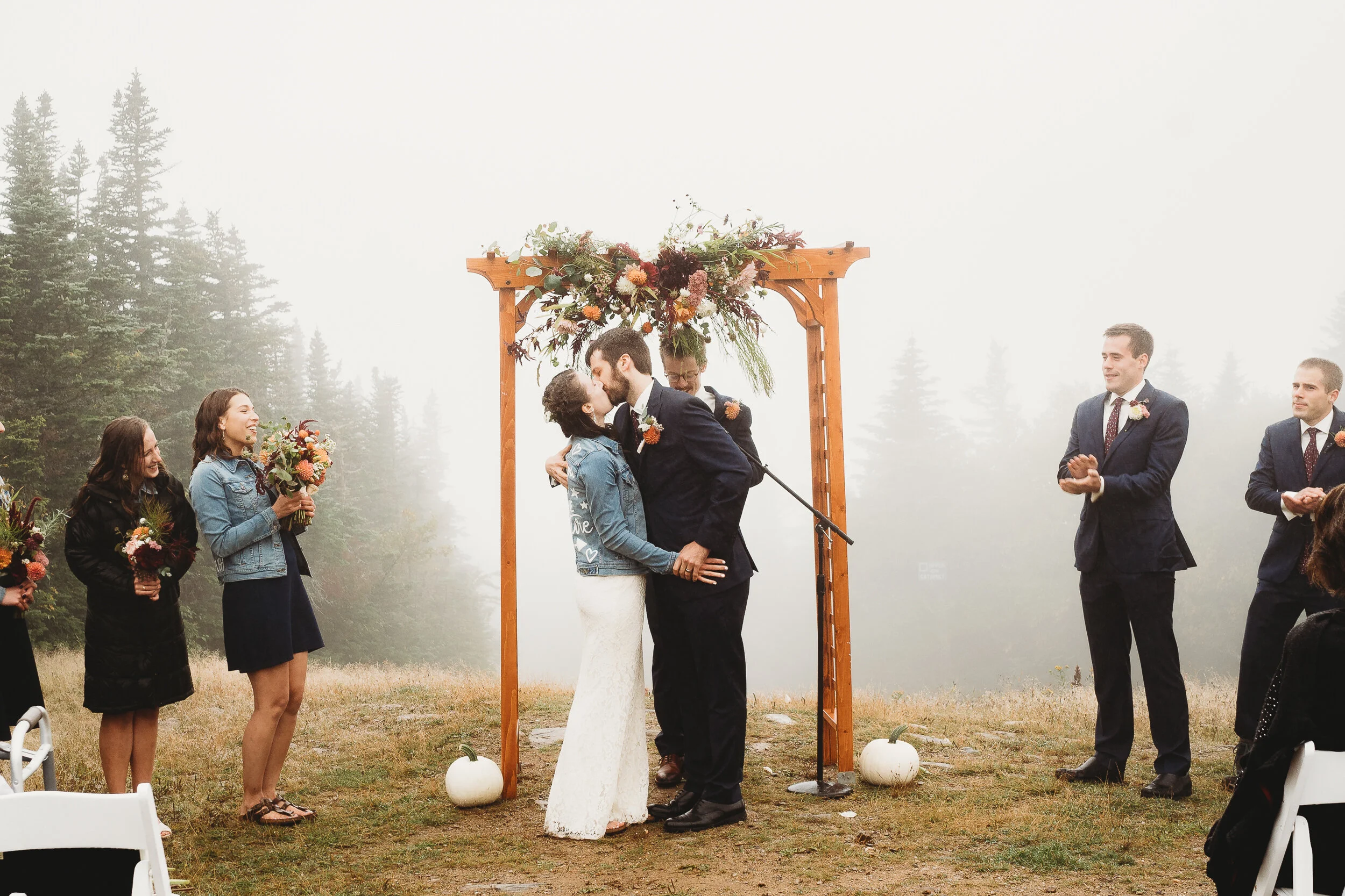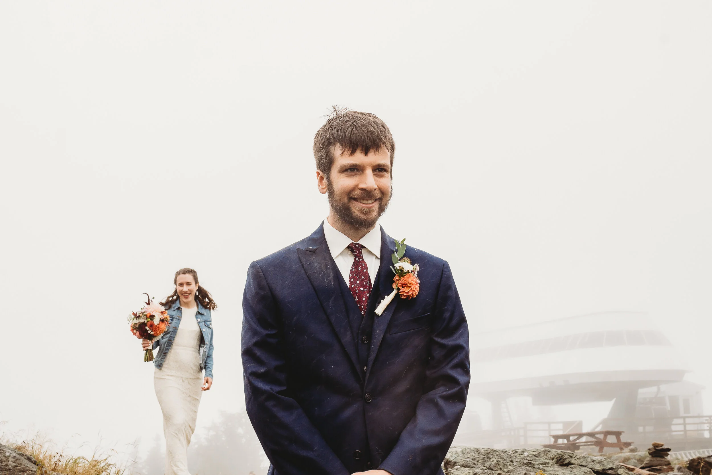 Britta and Brian were married on Saturday September 14, 2019 on the tippity-top of a incredibly foggy, wind-swept Wildcat Mountain in Pinkham Notch, NH which is located in the White Mountain National Forest across from Mount Washington. Despite inclement (and sometimes turbulent!) weather, their ceremony was absolutely epic, and a veritable Ulyssian adventure for all in attendance. Guests journeyed to the top of the mountain via gondolas through heavy winds, donning the readily supplied rain ponchos in anticipation of their ceremony. One had the distinct feeling that we were all in this together, witnessing something unique and memorable, knowing full well that we would all be left better for having experienced it. It was that kind of epicness that I struggle to convey with words, so make sure to check out the photos below! Thanks so much for allowing me to capture these memories for you Britta & Brian!
