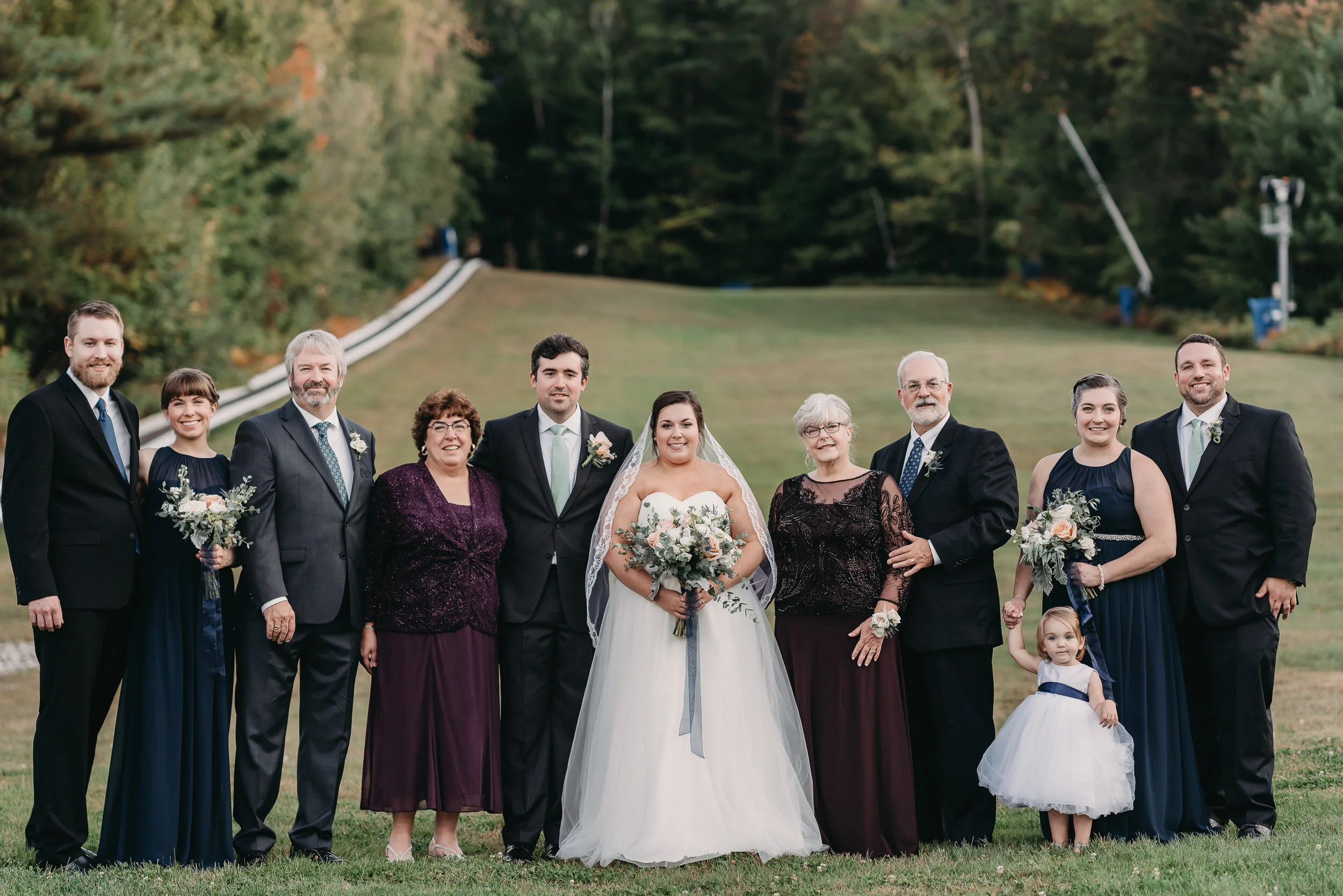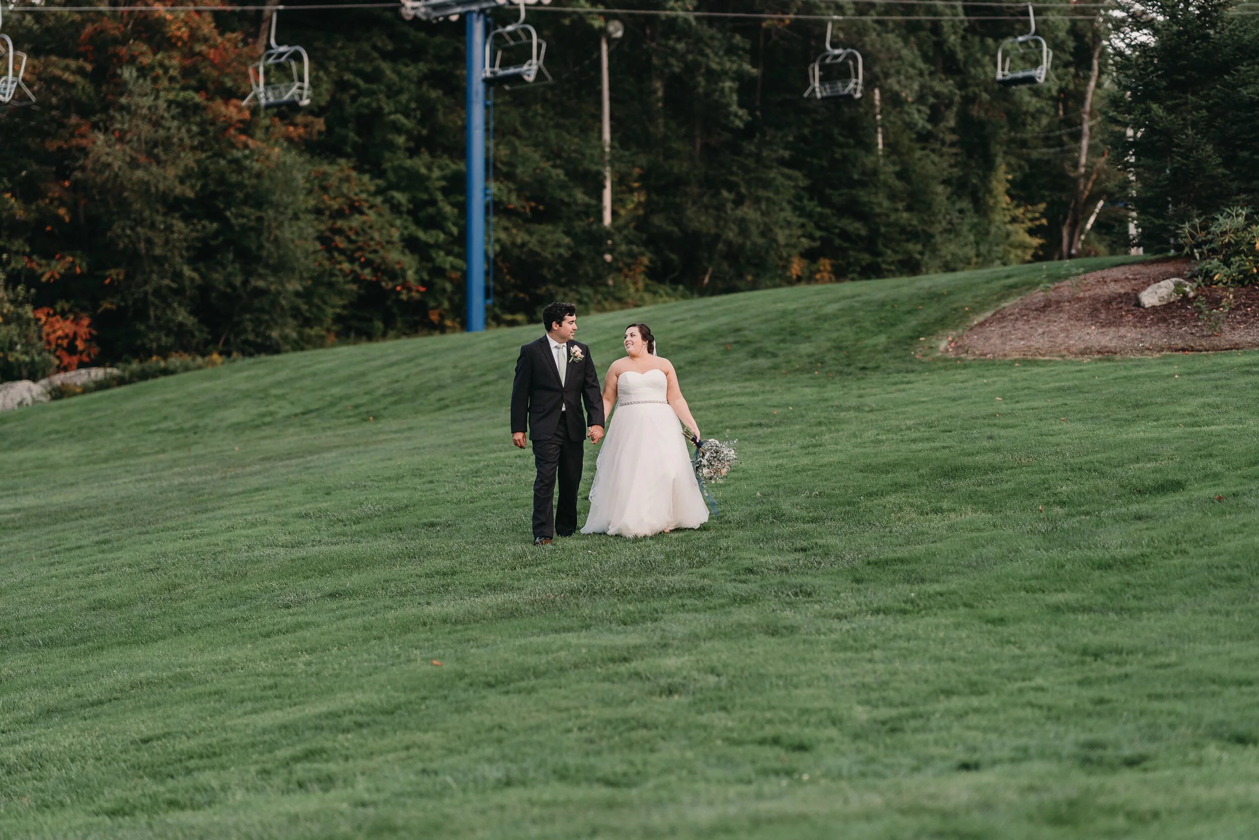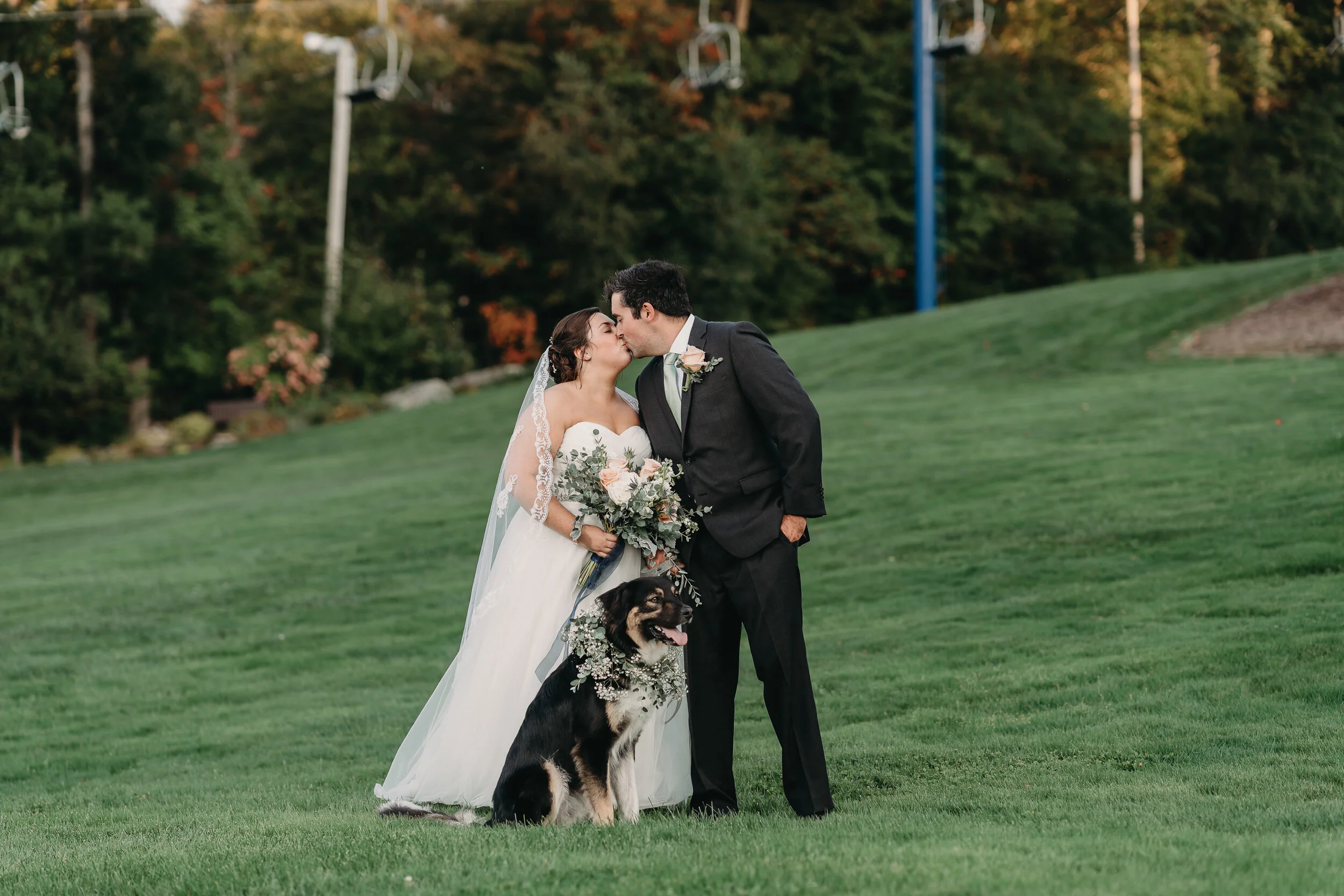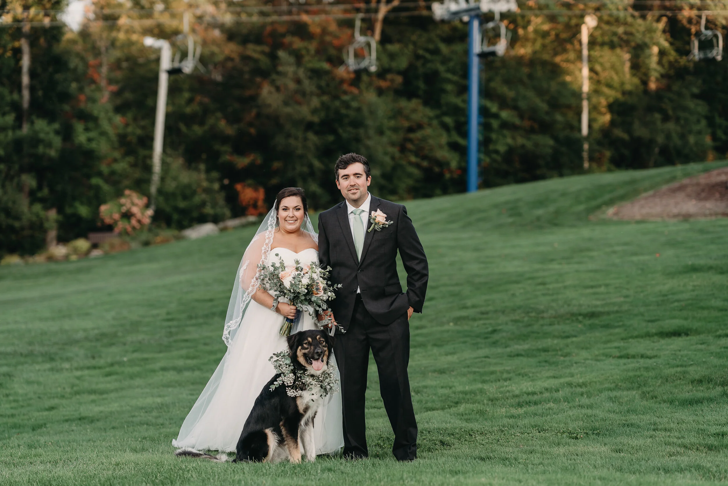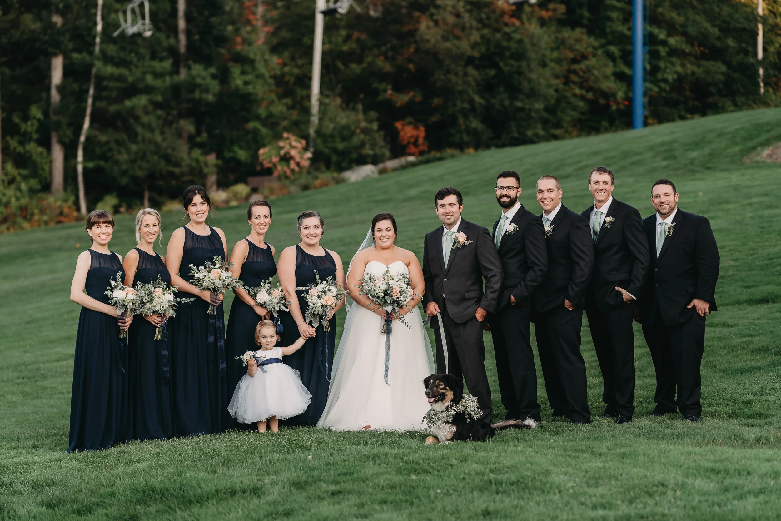 Fast forward a few years to the Summer of 2018 when I met Katherine & Matt while shooting the wedding of their good friends, Katie and Craig at Waterville Valley. I was so happy when they reached out asking me to shoot their engagement session and their fall wedding on Saturday September 28, 2019 at Pat’s Peak in beautiful Henniker, NH. Their wedding was marked by peak fall foliage, crisp autumn air, and an abundance of green with the ski mountain looming in the background. Katherine and Matt had a really fun wedding party comprised of family and friends, and included their dog Luna (who served as “Flower Dog”!), and Katherine’s 21 month-old niece Isabelle, as Flower Girl.